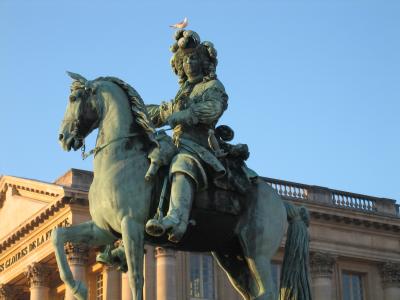 ベルサイユ宮殿入り口正面に立つ、ルイ14世像。おっと、頭に鳩ぽっぽが・...