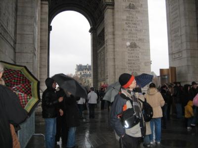凱旋門の真下には、悪天候に関わらず、大勢の観光客が集まっています。