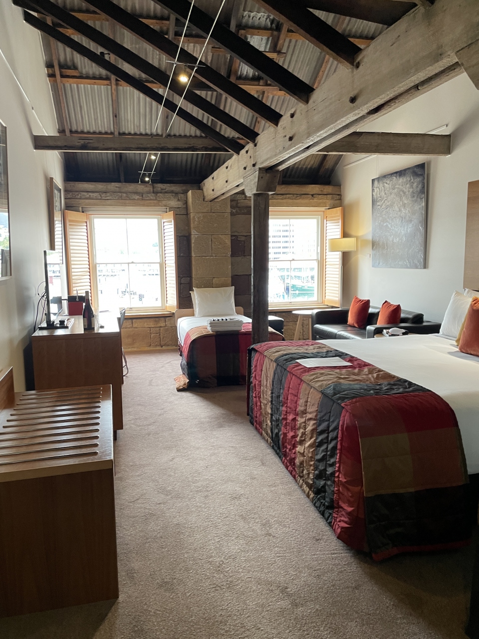 skybusのバス停から近く、港に面しています。全部の部屋かわかりませんが、部屋の窓から港が見えます。倉庫を改装したホテルでゆったりとした作りでした。吹き抜けの中庭は日中は暑かったです。ホテル内にたくさんの絵が展示されていて、お値段もついていました。行きませんでしたが、隣にアートギャラリーもあったようです。