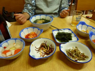 食事は部屋のある建物の上の階で、エレベーターも1機しかなく不便で、会場は古めかしいカーテンのかかった宴会場・・・昭和かな?