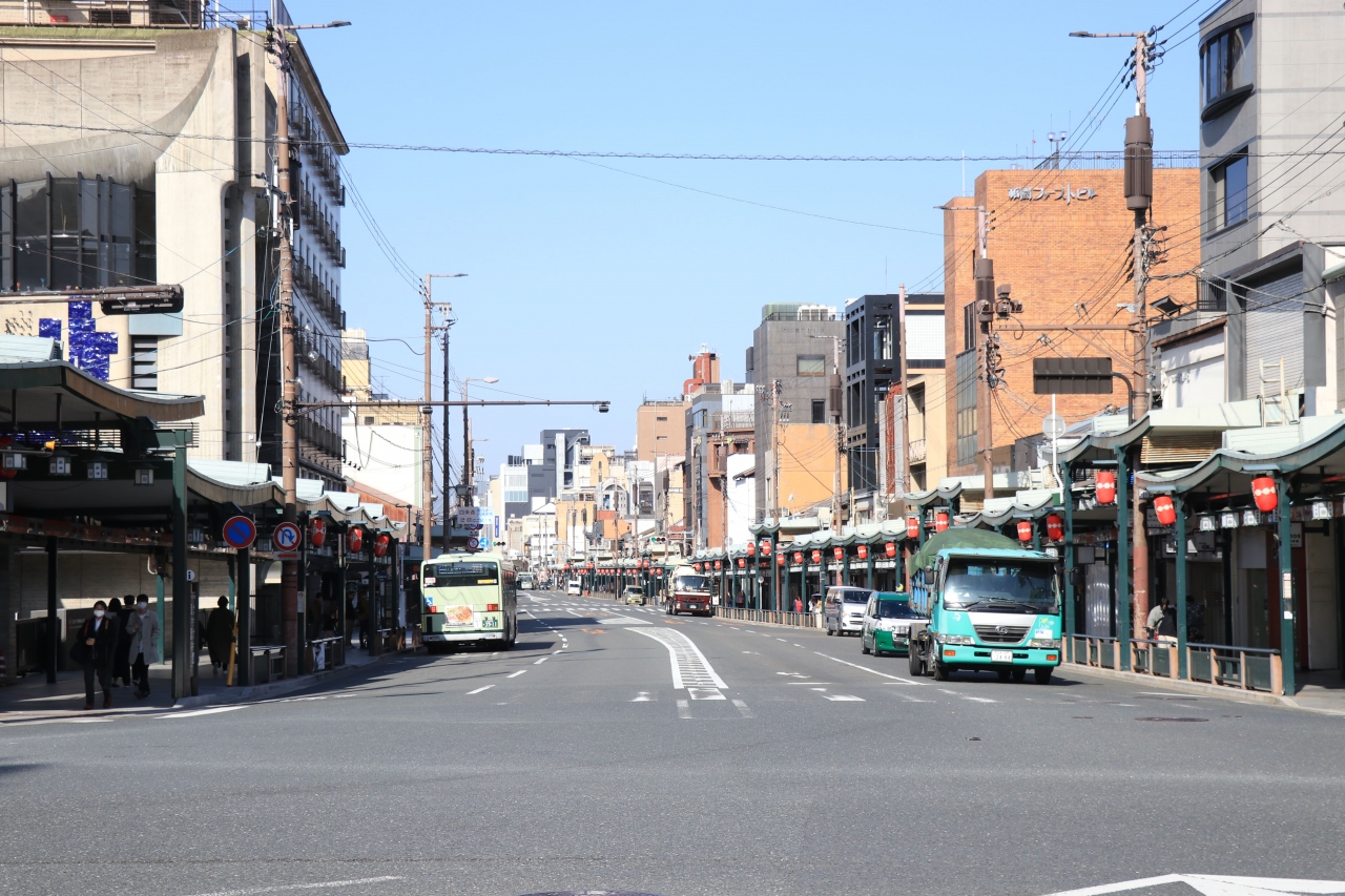 昼間時間帯でしたが八坂神社付近の通りは外国人を中心に多くの人の姿が見られました。道路も鴨川の少し手前~八坂神社前までは片側2車線となり渋滞解消に少しばかり寄与しているのかなと思われますが、車線の流れをよくわかっていない県外ナンバーとそれにイライラさせられている(と思われる)路線バスの姿も。歩道部分は一部をの次て屋根が設置されているので悪天候時でも傘を差さずに歩けるのは(混雑緩和という点から)かなり有用性もあるものではないのでしょうか?