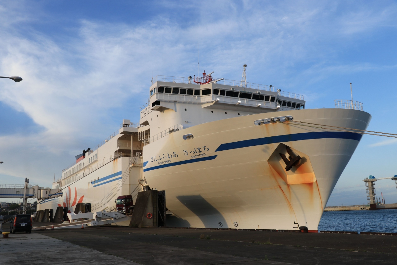 夕方便/深夜便と日に2往復している商船三井フェリーのさんふらわあ。車・徒歩乗船といくつか手段はありますが、茨城交通の(ごく)一部の便がターミナル前まで乗り入れる他、鹿島臨海鉄道の大洗駅からも歩いて15分弱と立地は悪くないかなと感じるところです。周辺にはめんたいパークや海鮮市場、大洗磯前神社などの観光スポットもあるので早く到着しても(車利用に関しては)安心。ターミナル内には飲み物の自動販売機しかないので、食料品などについては到着前の調達を忘れないようにしたいところです。