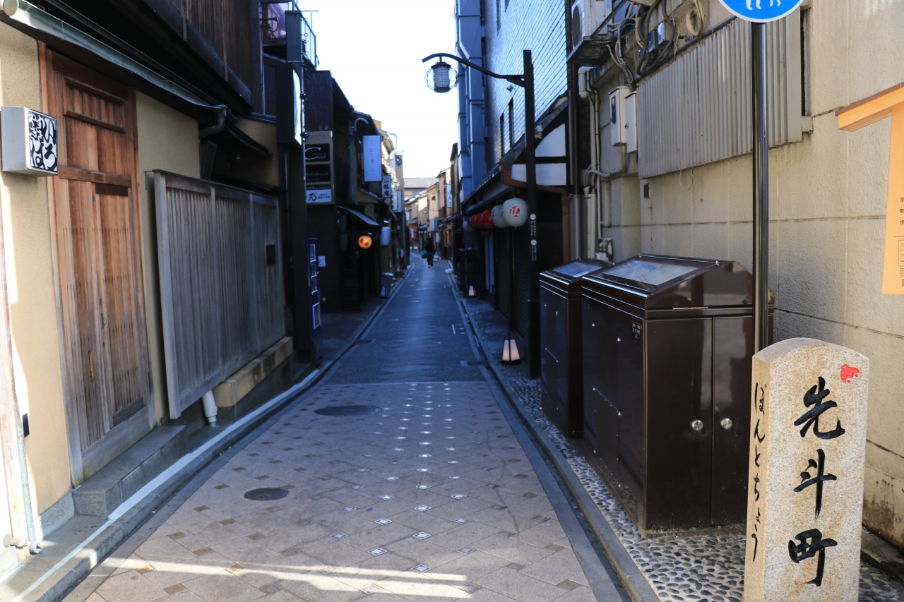 事前に調べていた中でアスファルトはなくタイル敷、電線も地中化されてレトロな雰囲気の中をのんびり歩ける場所・・・と思っていましたが、観光シーズンなのにやけに人が少ないなと思っていたら四条通を挟んで反対側がメインの場所だったようで北側は飲食店や雑居ビルが立ち並んでいるような状態でした。歩道はしっかりと整備されているので通行には特段支障は無さそうですが道幅が狭いので広がって歩くなどは避けたいところ。交差する一部の通りは(車に関して)一方通行となっているので標識などの確認はしっかりと!