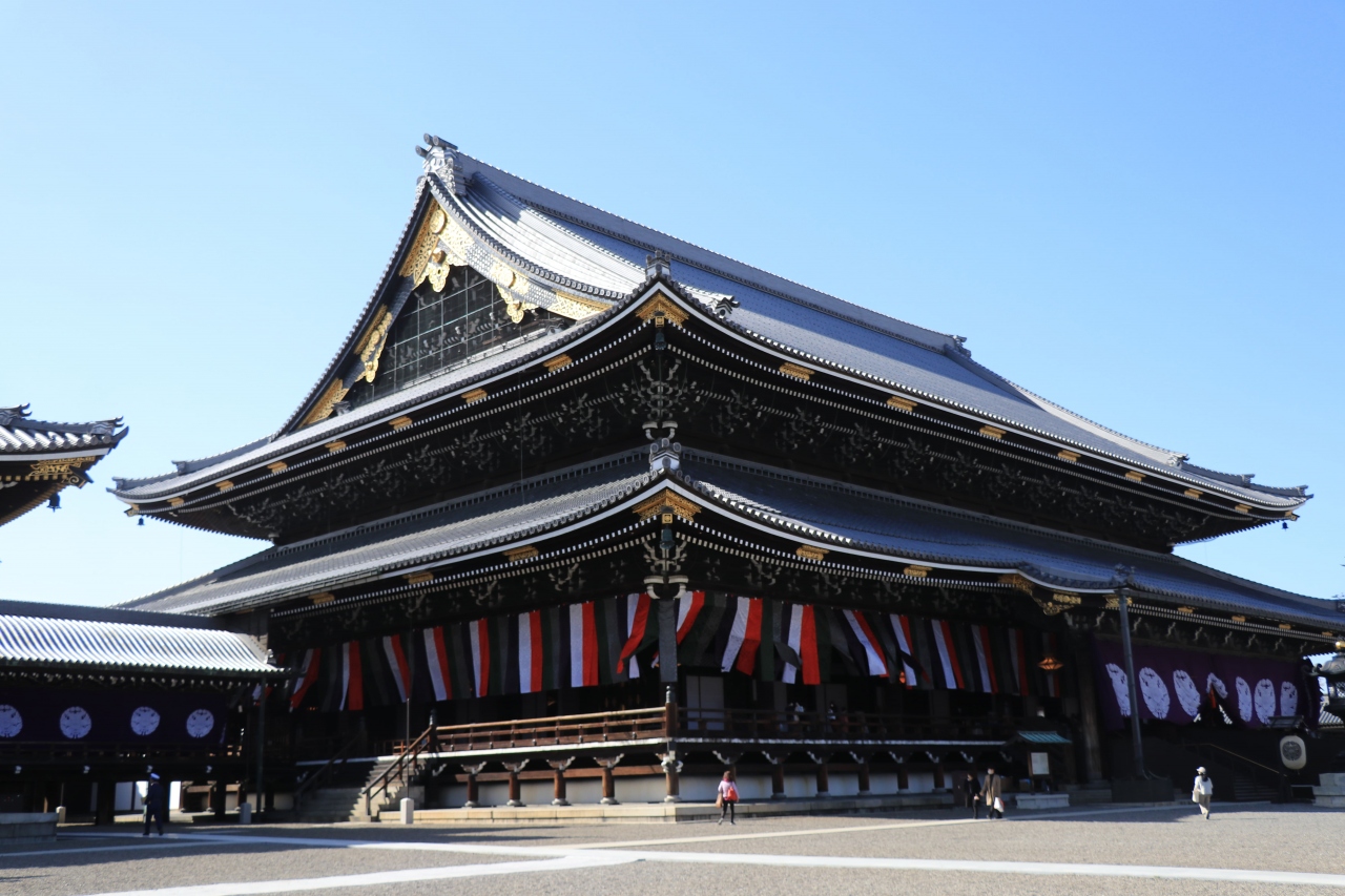 御影堂門の前にズラリと並んだ観光バス。何事かと思いましたが立教800年の記念法要そのほか諸々の行事が盛大におこなわれており(関西地区がメインでしたが)多くの信徒さんが参列されていました。仏旗や五色幕が張り出され荘厳な雰囲気となっていました。基本は砂利敷ですが、訪問時は先述のように多くの人が行き来するからか動線の目安となる通路や本殿までのスロープなどが設置されていました。普段はないと思われるので昇殿時には(そこそこ傾斜がキツイ)階段での移動が必要になるかと思われます。