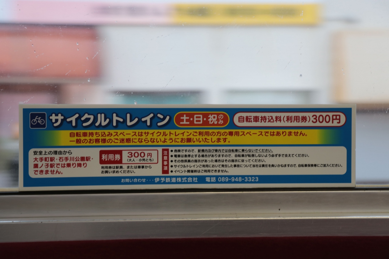 土日限定ではありますが乗車券とは別に1乗車300円で各自の自転車を車内に持ち込むことができるサービスを実施しており、一部のホーム敷地が僅少の駅は乗降不可となっていますが高浜線/横河原線のほぼ全駅が対象となっており自家用車を持っていない人には良いサービスなのかなあと思うところです。観光客で利用する人はまずいなさそうですが・・・