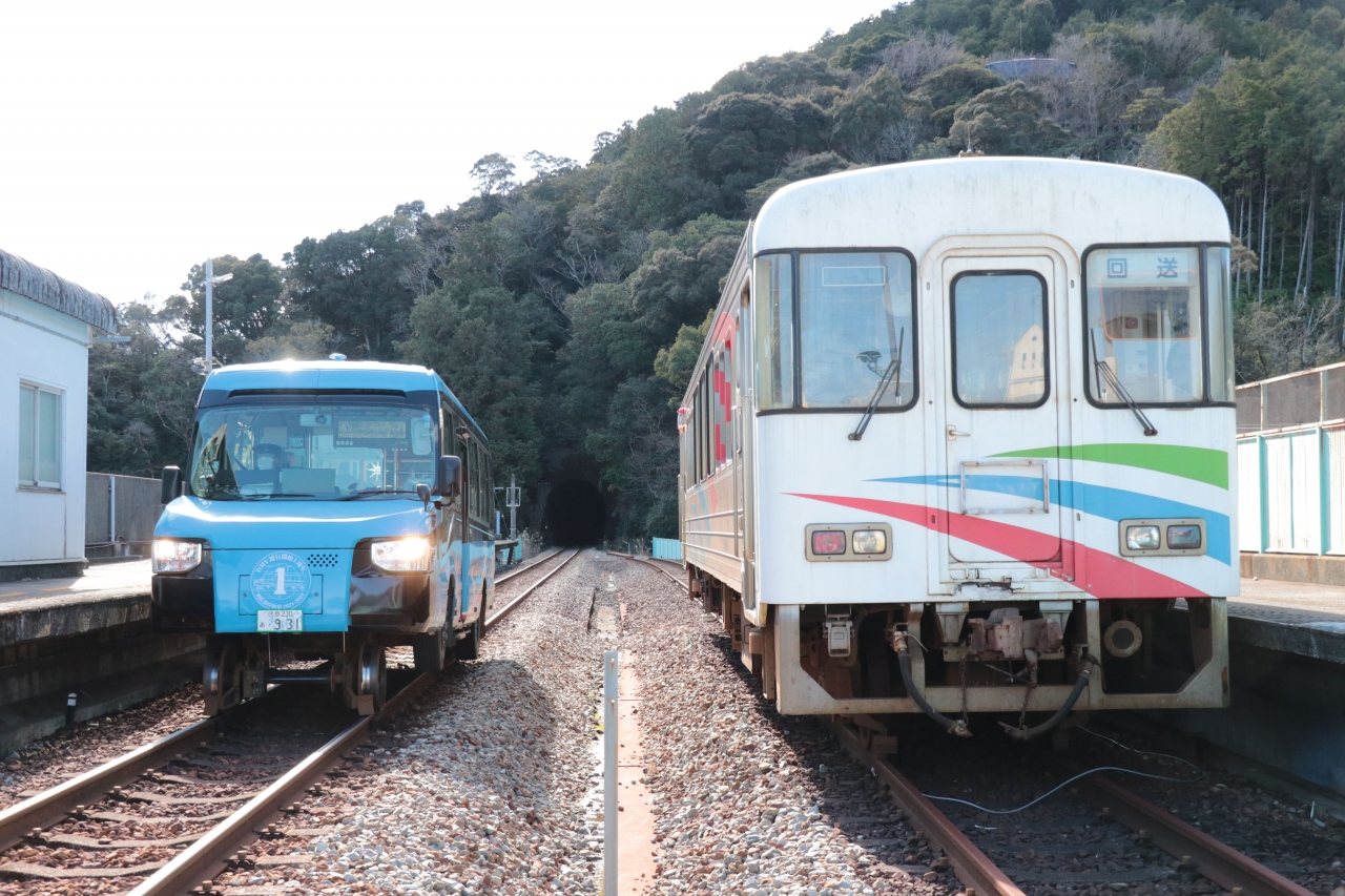 元々鉄道路線として走っていた時の車両が海部駅に留置されており、現在使用されているDMVと並んだ写真を撮ることができますがその大きさの違いにはびっくり。鉄道車両はホームから乗降しますが、こちらは地上から直接乗り降りすることもあり同じ場所を走っているようには見えない光景が広がっていました。(実際には鉄道車両はDMVと同じ線路を走ってはいけないようなのであくまで並ぶだけですが・・・) マイクロバスに乗っているような感覚で、乗り心地はあんまり・・・といったところでしょうか?