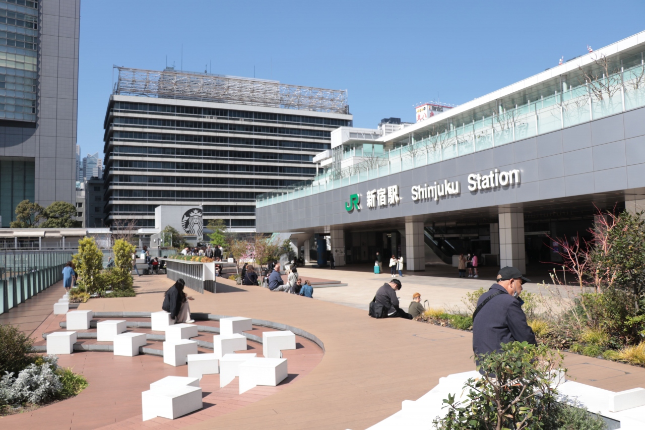 JRの新南口からすぐの場所にある広場。(敷地面積が広いため一概には言い切れませんが)南側に関しては都心の一等地にあるとは思えないほどのんびりとした空気が流れていました。昼間時間帯でしたが人の数はまばらで長椅子には空きが見られるほど。緑もあり隣接するバスタや駅ホームよりも天気次第ではこちらで時間待ちをするのも一つの手かなと思えるところです。JR線の真上にあり一部箇所からはすぐ下を走る電車の姿も見られるので子供連れにもオススメ。