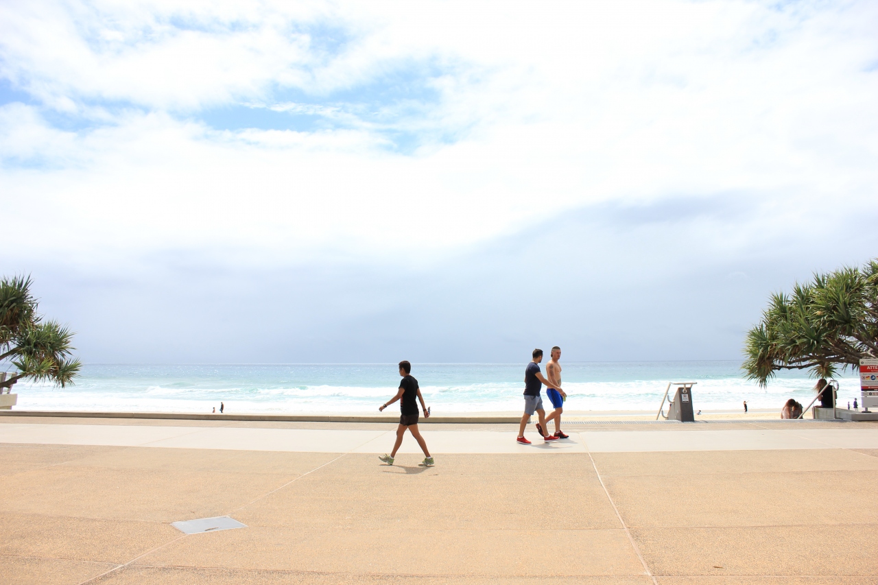 サーファーの聖地とされているビーチで、多くの人がサーフボードを持っています。