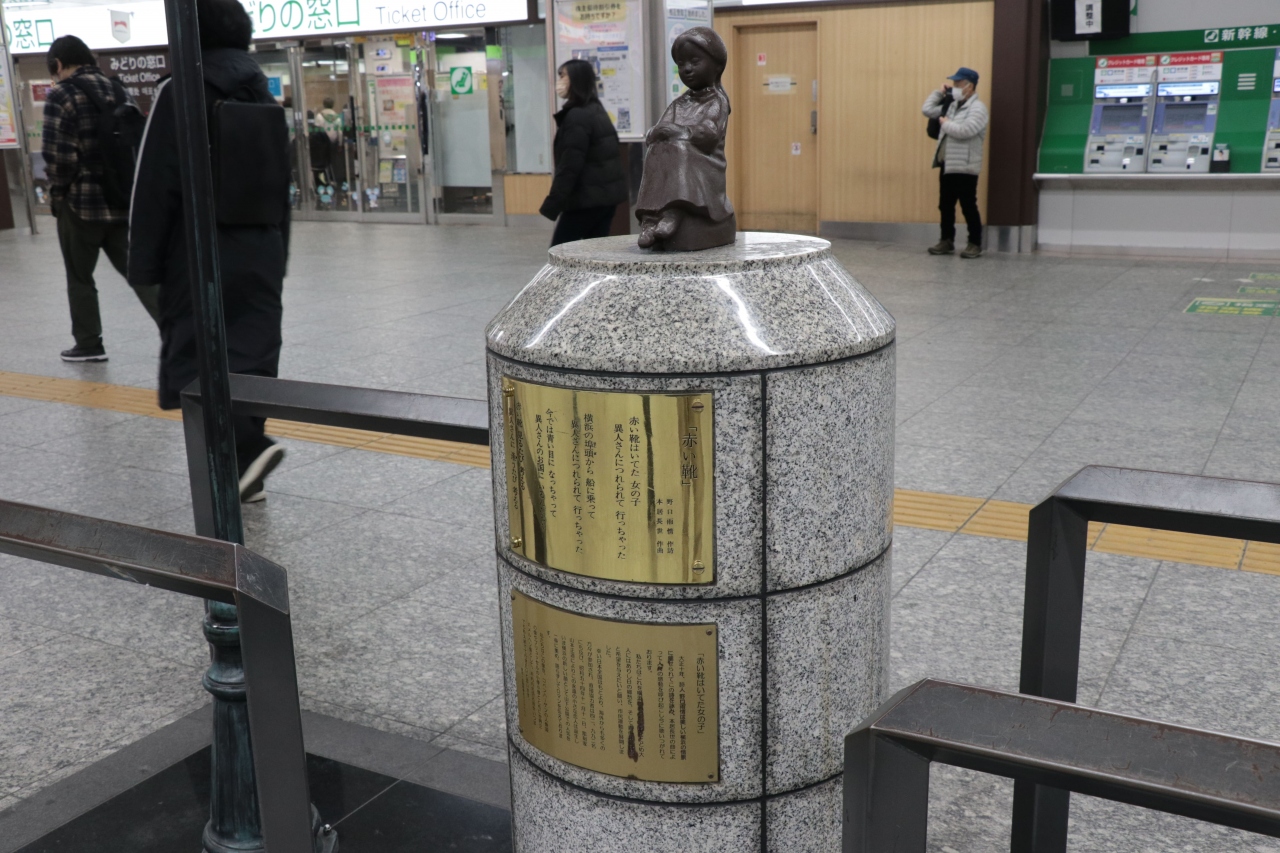横浜駅の中央自由通路の真ん中付近にあります。中央南改札横の券売機前あたりにあり、崎陽軒の店舗を目印にすると分かりやすいかもしれません。像の説明などは他の方に譲るとして、これ単体だとほとんど見る人も見える人もいないのかなと感じるほどの小ささですが、隣にはガス灯のようなものがあり広くて人通りがめちゃくちゃ多い横浜駅の中でも待ち合わせ場所として使えそうなロケーションとなっています。