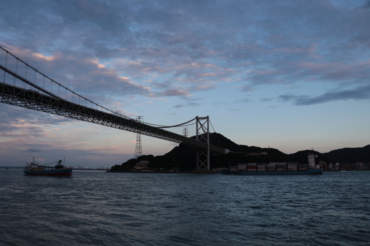 関門海峡の中でも最も両岸が近くなる部分で潮の流れが非常に速いことで有名となっているようですが、実際に見ていてもその流れは実感できるほどとなっています。関門橋が架かっているエリアが一番狭いようで対岸まで5-600mほどしかない中でも大きな貨物船がどんどん通過していくので、ぶつかってしまわないか心配になってしまいます。