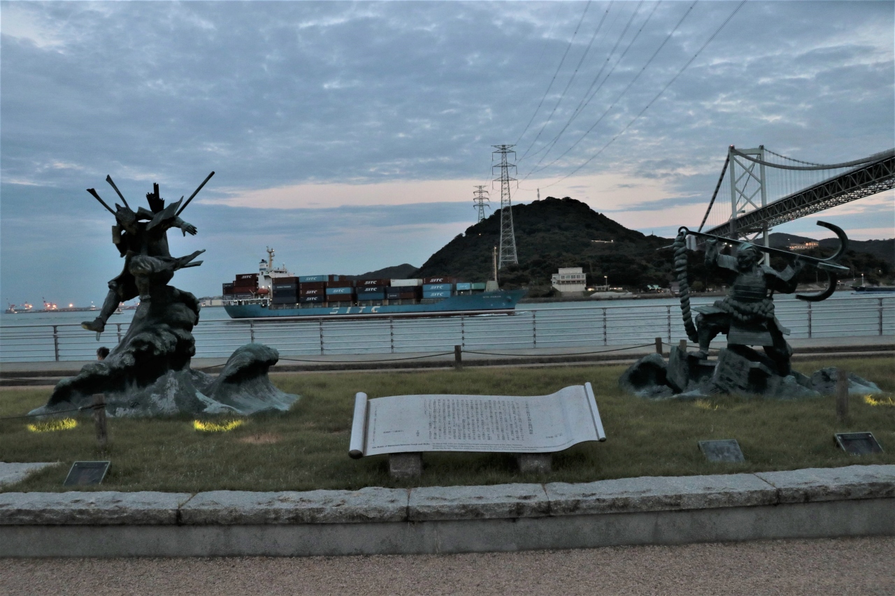 日本史で勉強することとなる壇ノ浦の戦いはこちらが舞台となりました。近くには源平両氏の像が建てられている他、当時の安徳天皇の入水の様子が描かれた絵もあり改めて歴史の中での一コマとしてあったんだなぁと感じました。みもすそ川公園の敷地内にあり目の前には関門海峡を望むロケーション。歩行者用の関門トンネル入り口からは道路を挟んですぐの場所にあるので合わせて訪問してみるのも面白いかもしれません。
