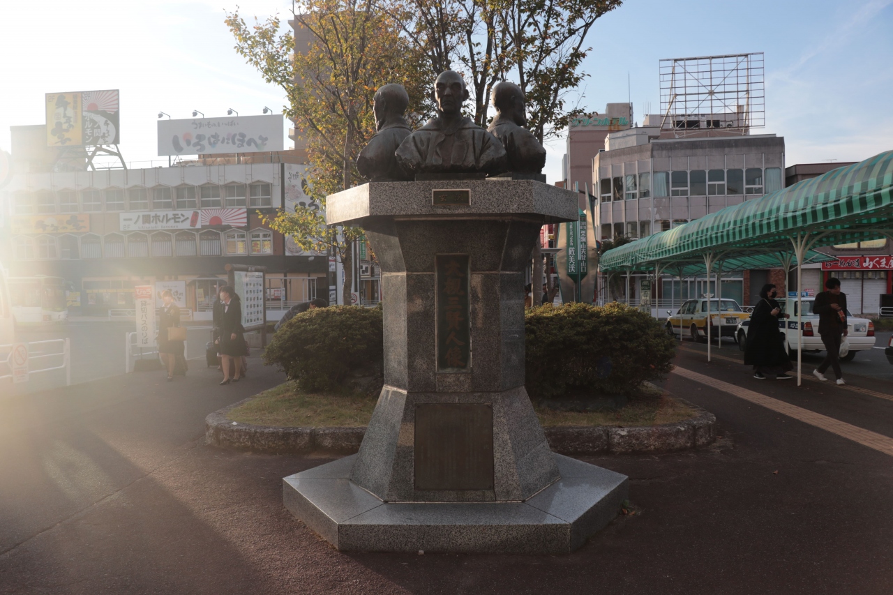 駅舎を出てすぐの場所にありある程度目立ってはいましたが辺りに人の姿はなく、少しばかり寂しい光景が広がっていました。普通に横に並んでいるのかなと思っていましたが一つの土台の上に三人がそれぞれ別の方向を向いて建てられている状態でぎゅうぎゅうでした。- 旅行時期