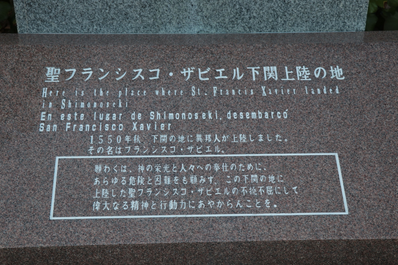 最初に上陸したのは鹿児島県と言われており、ここ下関や上洛した先の京都などでもキリスト教の布教をしたといわれているザビエル。石碑はけっこう立派なもので顔部分と解説のほかに赤地に謎の黒マークがありましたが、どういった意味なのかはよく分からず木になるところです。
