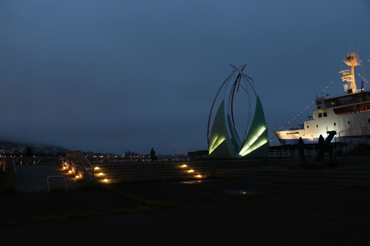 夜間だったので全体的に暗かったのですが、岸壁で釣り糸を垂らしている人の姿がぼちぼち。特に話しかけるようなことはしませんでしたが、どのような魚が釣れるのかきになったところではあります。名前にもありますが、イカのモニュメントが現地にはあり夜に見ると光が当たってちょっと不気味かも・・・(笑)