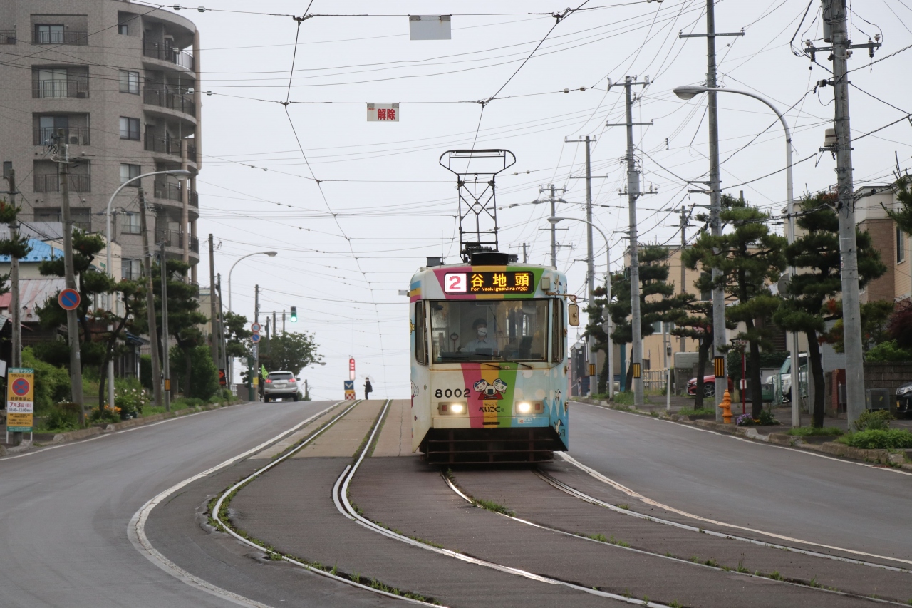 住民にも観光客にも(?)なじみが深い函館市電。山坂ある場所も通過していくこともありバスなどと合わせて意外と需要はありそうです。専用軌道はなく全線を通して道路との併用軌道。窓の外を眺めていると車と併走しているなんてこともあり目新しさを感じる瞬間もありそうです。