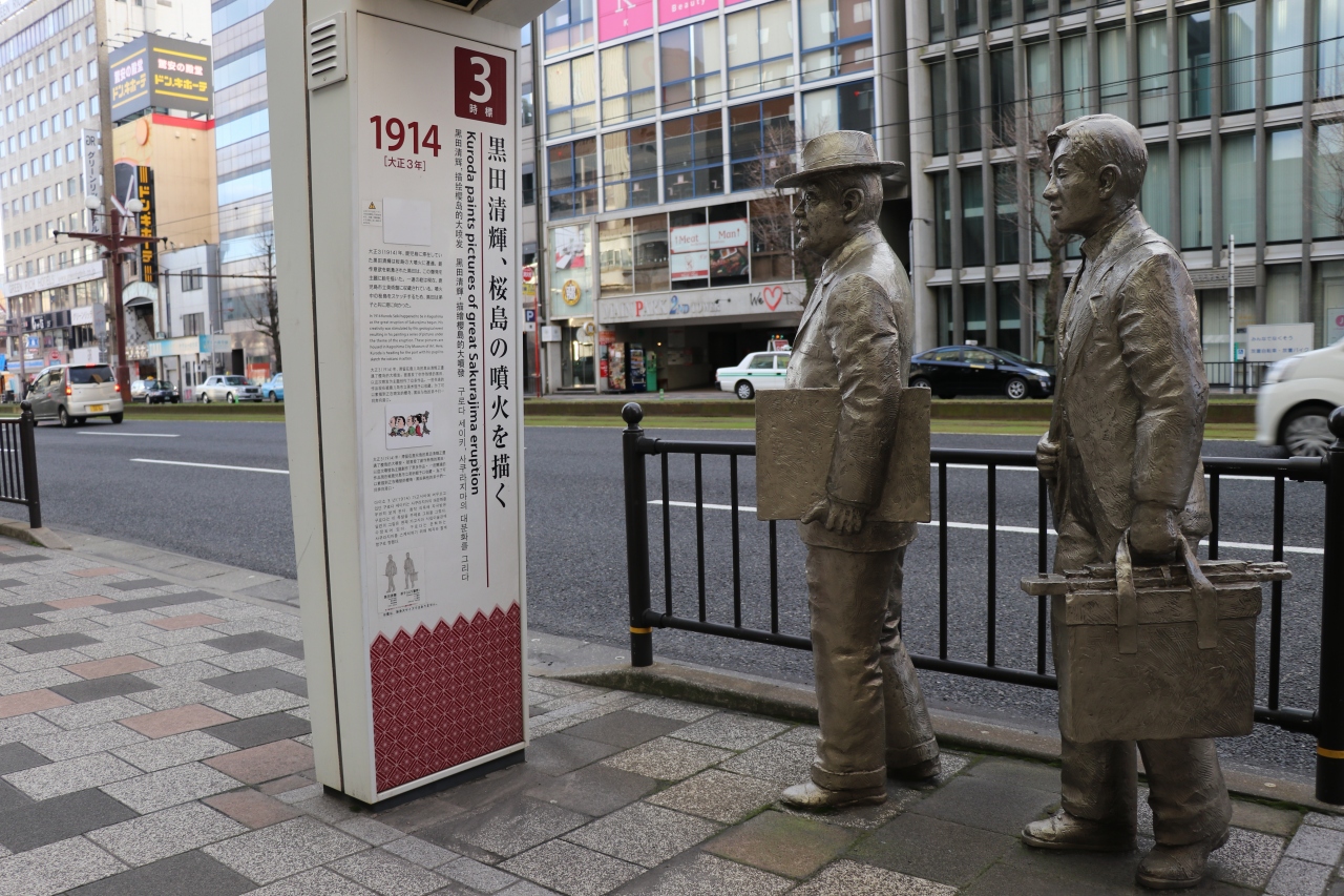 黒田清輝が薩摩生まれなのも桜島を描いた作品があることも知らなかったのですが、市立美術館に収蔵され営るようなので見に行くきっかけになるかもしれません。近くを通ったときは見てみるのも良いかも。キャンバスを持つ黒田と荷物を持つ弟子の2人が像になっています。