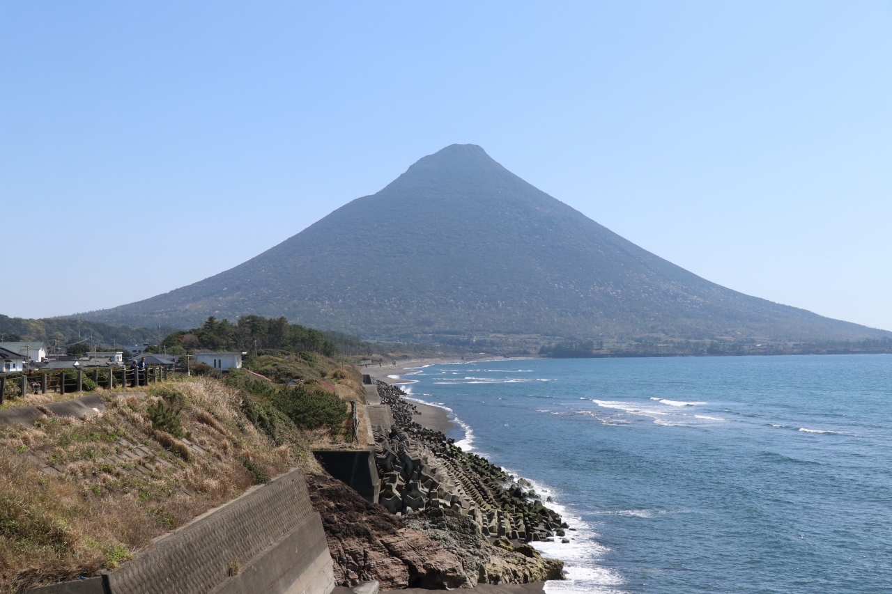 海と橋の先に見える開聞岳。時々パンフレットで見る写真はここから撮っているのだと思われます。ただ、整備されていない獣道(というほどでもありませんが)を潜り抜けていかないといけないので、子供連れなどはちょっと離れた別の場所から見るのがよいかもしれません。