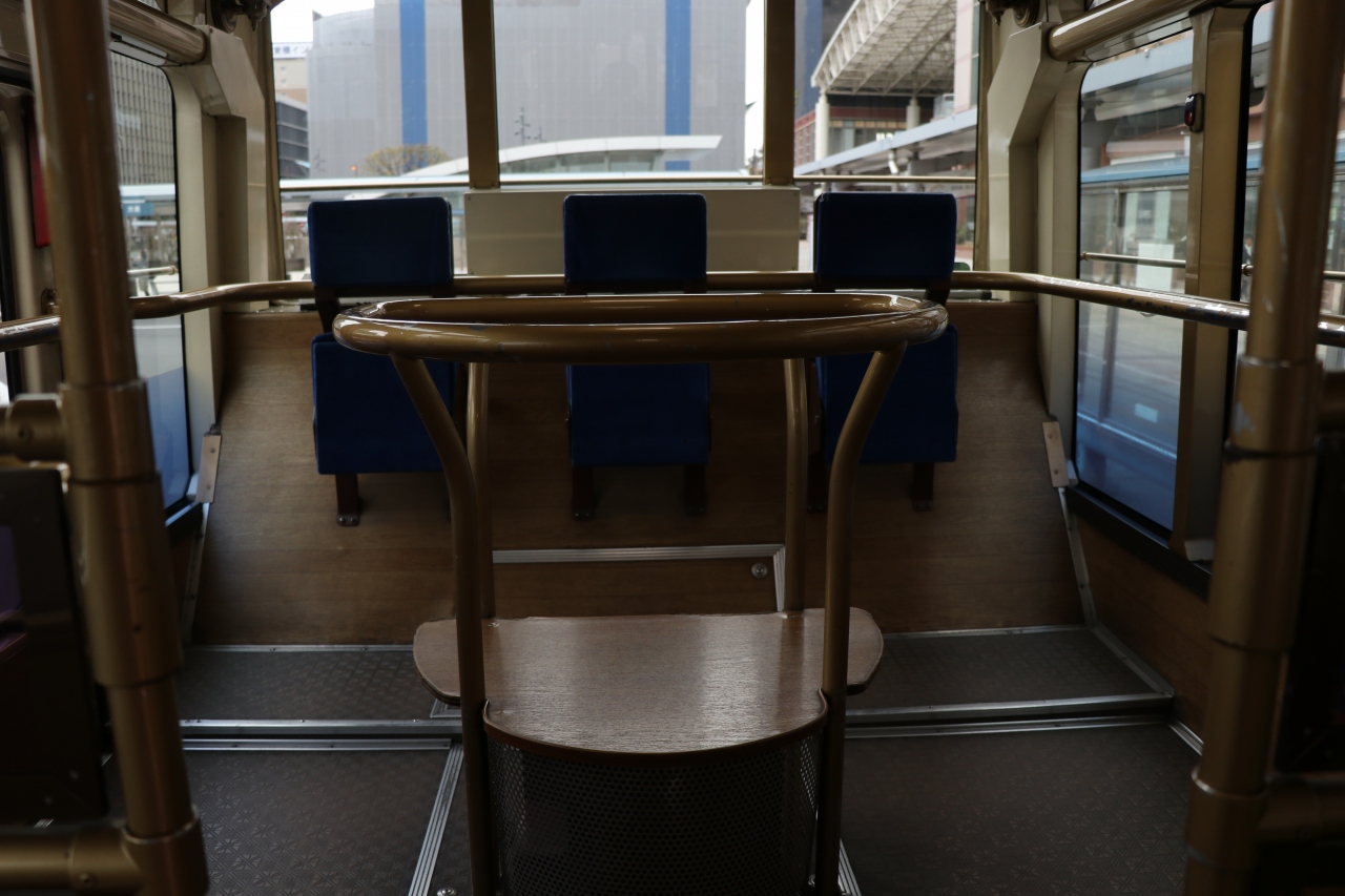 通常の路線バスとは異なり、後部扉より後ろ側の座席が最後列だけであとは手すりのような場所につかまるスタイルです。お客さんが多いときは着席人数が限られる反面、少しでも多くの人が乗れるという利点はあるのかなと感じました。本数は30分に1本と分かりやすいダイヤですが、ほぼ同じコースを運行しているいわさきバスの「まち巡りバス」と紛らわしいのでよく確認した上での乗車が必要です。