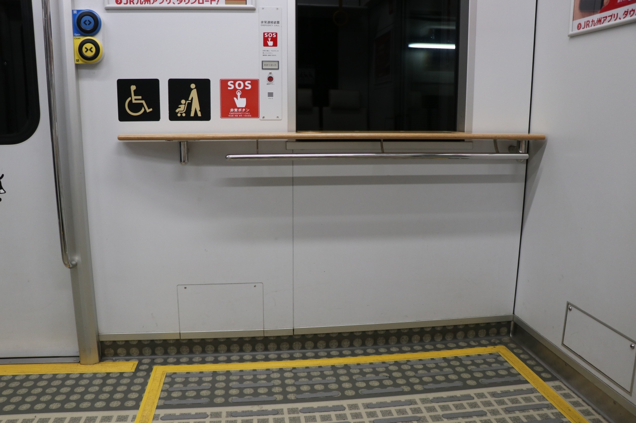 直通するJRのしゃりょうでしたが、車端部に座席が取り払われているスペースがあり、空港アクセス路線としてキャリーケースなどの荷物を持った人でも快適に利用できるように工夫されていました。そしてそこにはなぜかドリンクホルダーのような小さいくぼみも・・・ 座席がフカフカで座りやすかったのが良かったです。