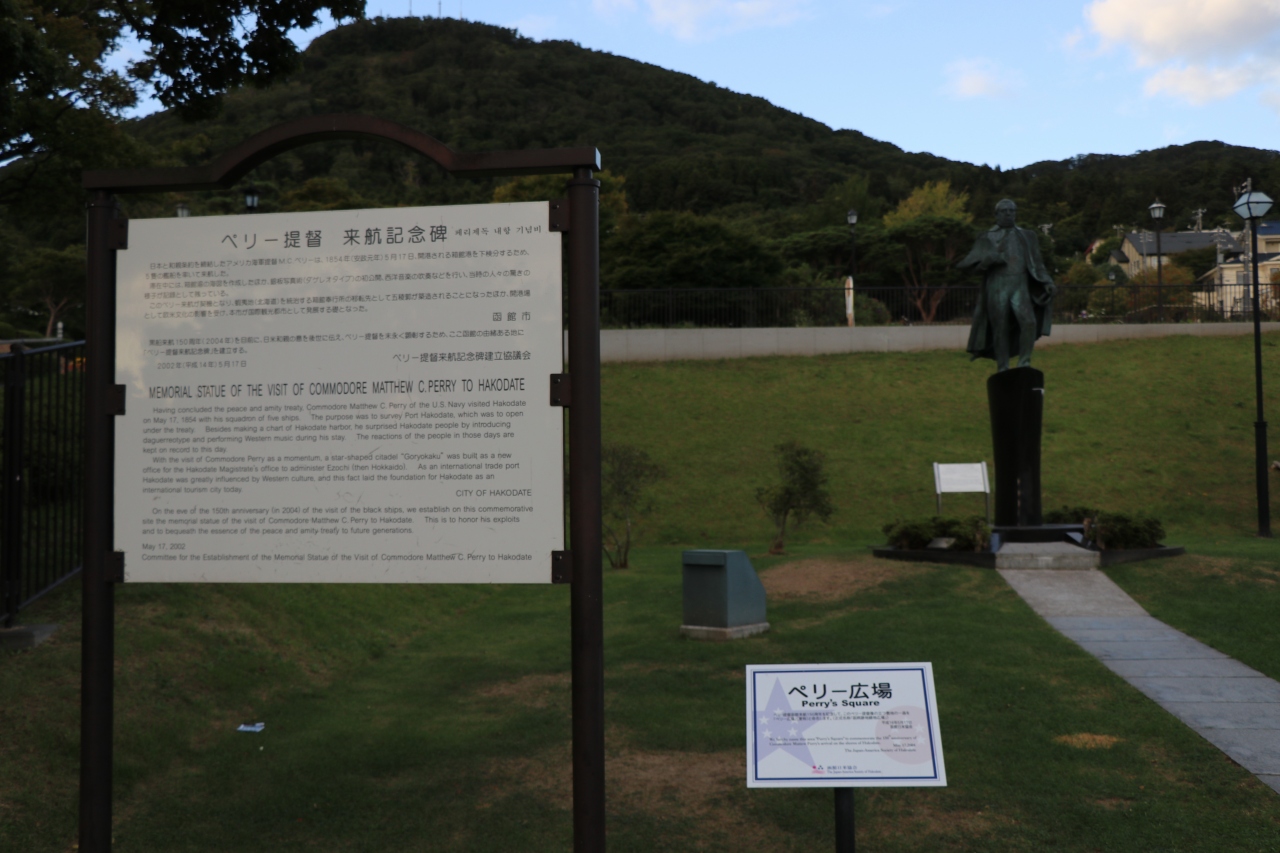 銅像はペリーが立っているだけです。来航記念碑なら船もあっても良いのかなぁと思ってしまったり。基坂の上側向かって右の広場にありました。散策ついでにちょっと眺めてみるのも良いかもしれません。来航150周年を機に建立されましたが、英語での説明もあるので外国人観光客も楽しめます。
