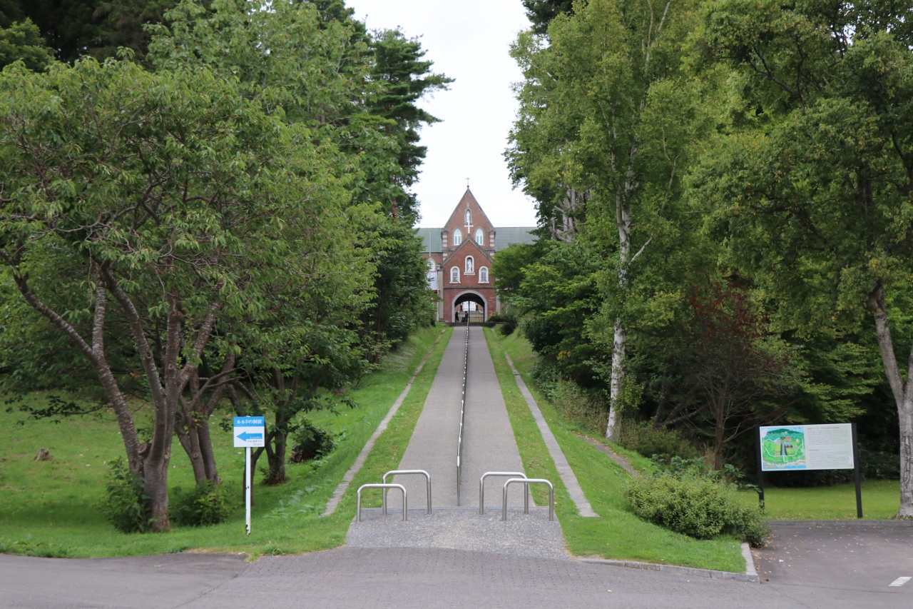 訪問が平日昼間ということもあり、他に観光客はいましたが写真を撮っても目立たないレベルの人数でした。いさりび鉄道の線路を渡ってすぐの場所にも駐車場はありますが、空いていそうならそのまま道なりに進んで売店建物横にも停められるスペースがあります。修道院の見学は完全予約制でふらっと立ち寄れる場所ではありませんが、手前の木々はSNS映えするすごいスケールです。