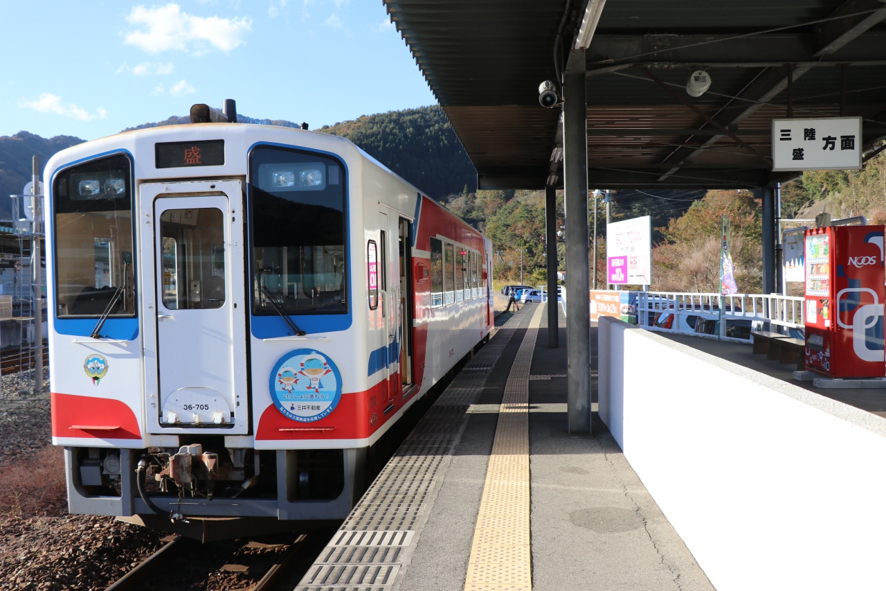 釜石~盛を50分ほどで結んでいます(訪問時は旧山田線区間は再会していませんでした)海が全く見えないわけではありませんが、基本的にはトンネルがほとんどでそれ以外の区間でも北リアス線とは異なり防潮堤に阻まれるところが多いです。それだけ海に近く標高がないということなのでしょうが・・・ 日中時間帯であれば全列車が観光名所の恋し浜駅に3分ほど停車するので記念撮影も可能です。個人旅行で行きましたが、途中駅からツアー客が乗車してきて車内は満員に。空いている車内を満喫したい方もいるかと思いますが、こればっかりは運なのかなぁと思います(ちなみに平日でした)