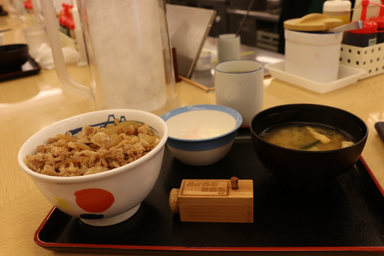 チェーン店なので味や値段に変わりはなく、吉野家やすき家と比べると少々高いものの温かい味噌汁が付くのが個人的にはありがたいです。カウンターがずらっと2,30席並んでおりテーブル席がないこともあってか、満席でも客回転は速く待ち時間も長くならないですね。