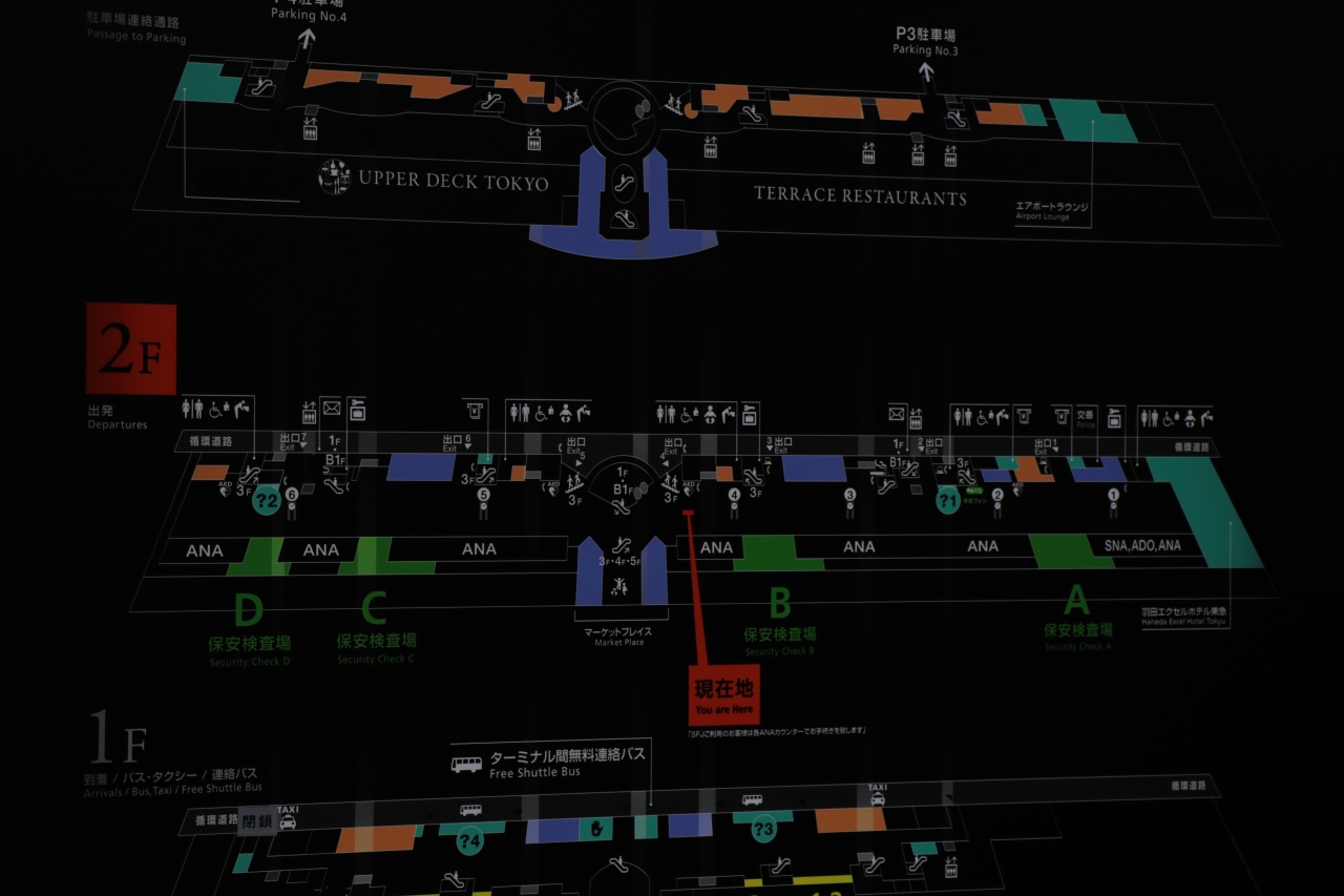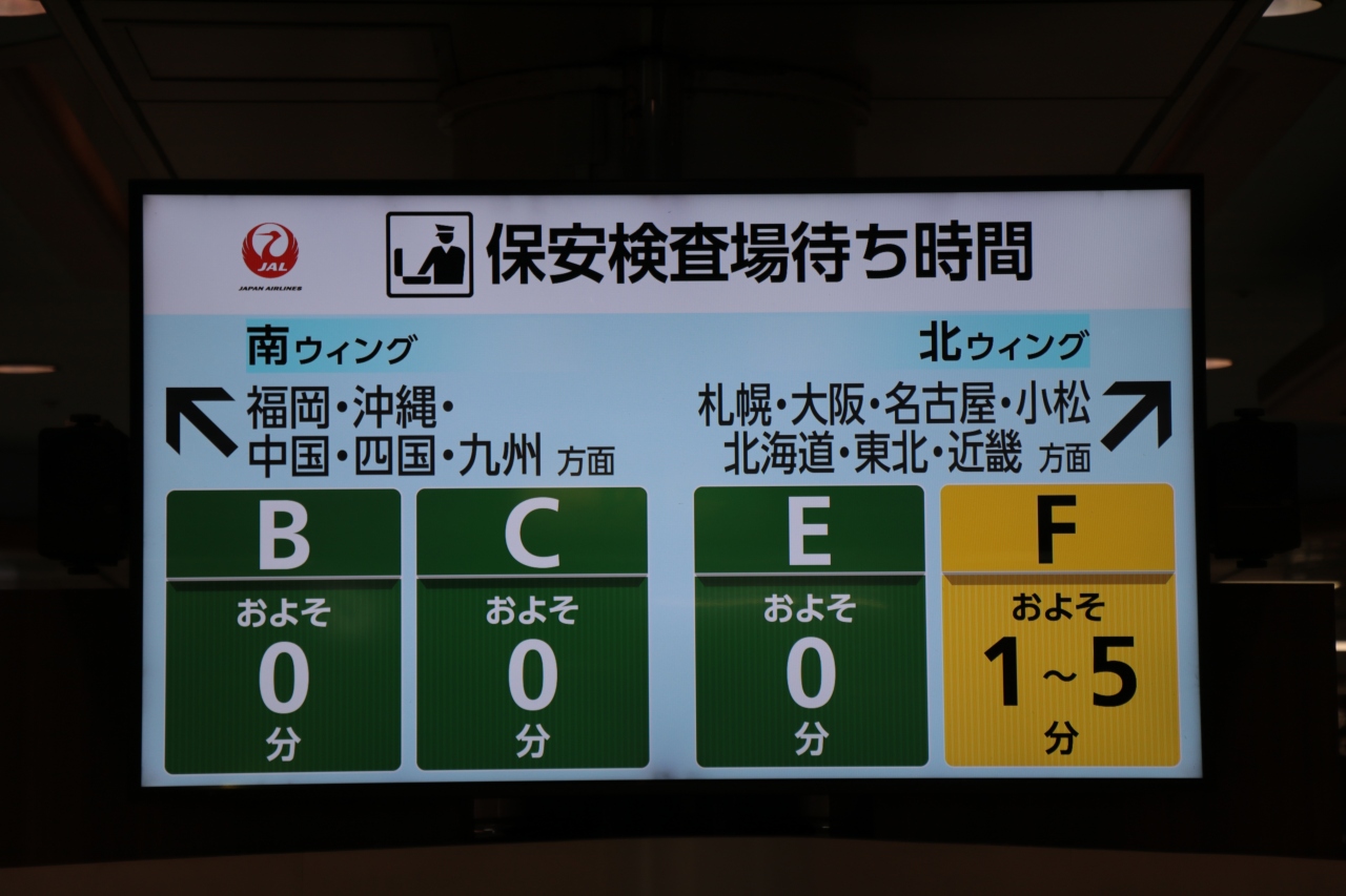日本航空の利用者限定ですが、B・C・E・Fの4つそれぞれの検査場のおおよその待ち時間が京急とモノレール出口に表示されているので、各ウィングで混み合っている検査場がどこなのか把握でき事前に避けて空いている検査場へ向かうことができます。行先により使える検査場が異なる他、スカイマークとスターフライヤーはそれぞれ一番端の保安検査場しか使えないので注意が必要です。第2ターミナルとは異なり、中央のマーケットプレイス内には椅子やソファがあり、人通りもあまりないので静かに過ごすことができます。
