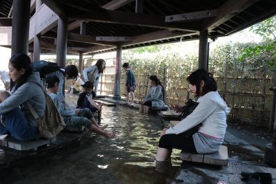 平日訪問のせいもあったのかもしれませんが、常に誰かしら入っているものの席が全て埋まるということはありませんでした。熱いのかなと恐る恐る足を入れてみましたがそんなことはなく、椅子に背もたれもついているのでゆっくりと読書をして過ごしている人もいました。足蒸しが無理な人はすぐ隣に普通の足湯があります。