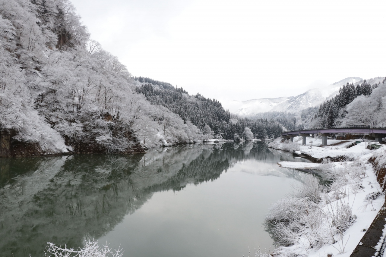 ポスターなどで見たことがある人も多いであろう、只見線が橋を渡る光景を遠くから写せるスポット。新緑・紅葉・雪景色と四季を通して様々な光景を見せてくれる場所となっています。今回は普通列車に乗って橋梁から探してみましたが、さすがに肉眼で見つけることはできず。それでも只見川と周囲の山々が合わさった光景が見られるのは至高の瞬間でシャッターチャンスになること間違いなし。会津若松から向かった場合はトンネルを抜けてすぐの場所になるので、会津桧原駅を過ぎたら準備をしておくと良いかもしれません。