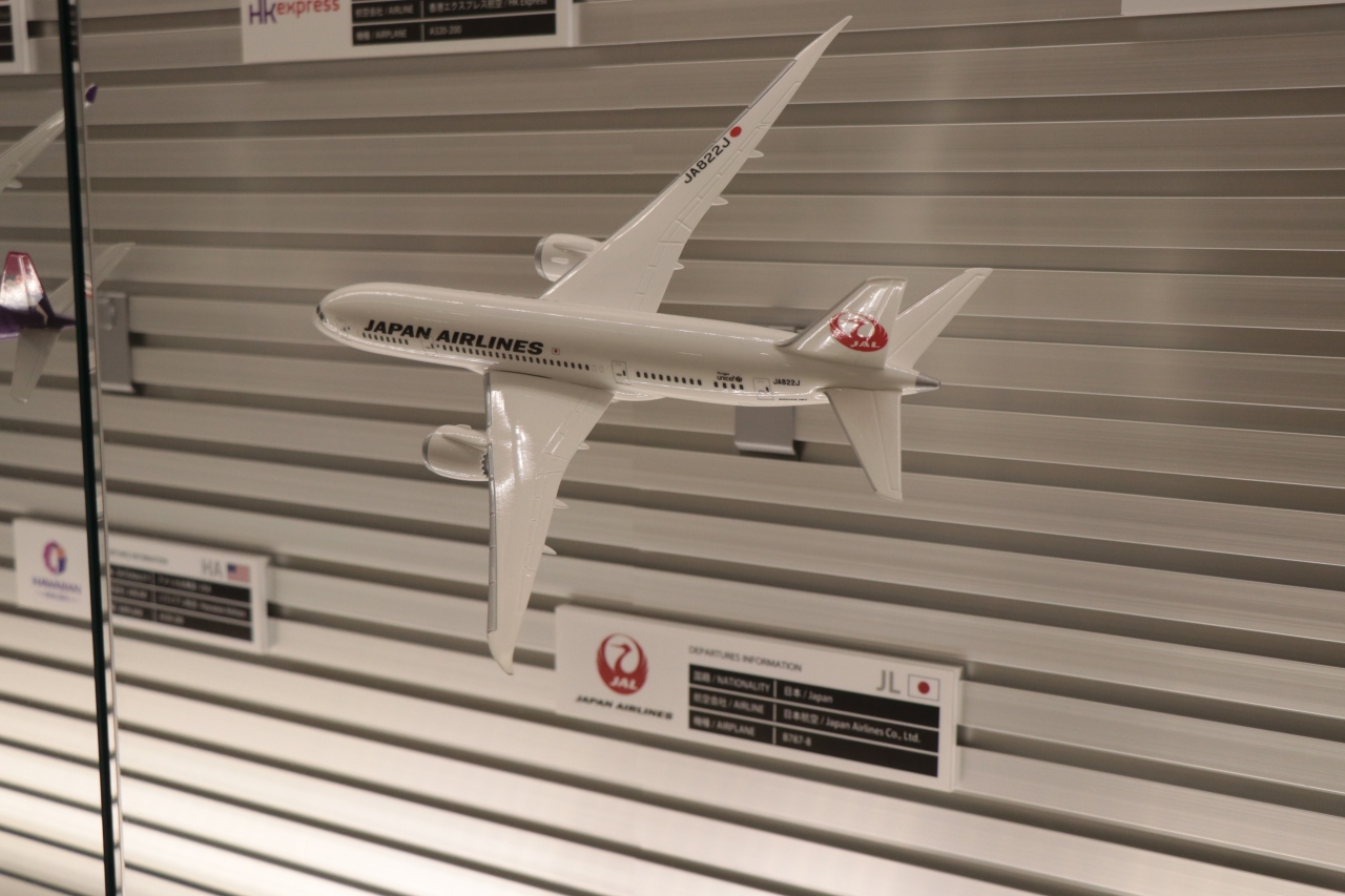 ここには羽田空港国際線ターミナルに就航しているエアラインの模型が飾られており、日本航空や全日空をはじめ、各国航空会社の機体を見ることができます。