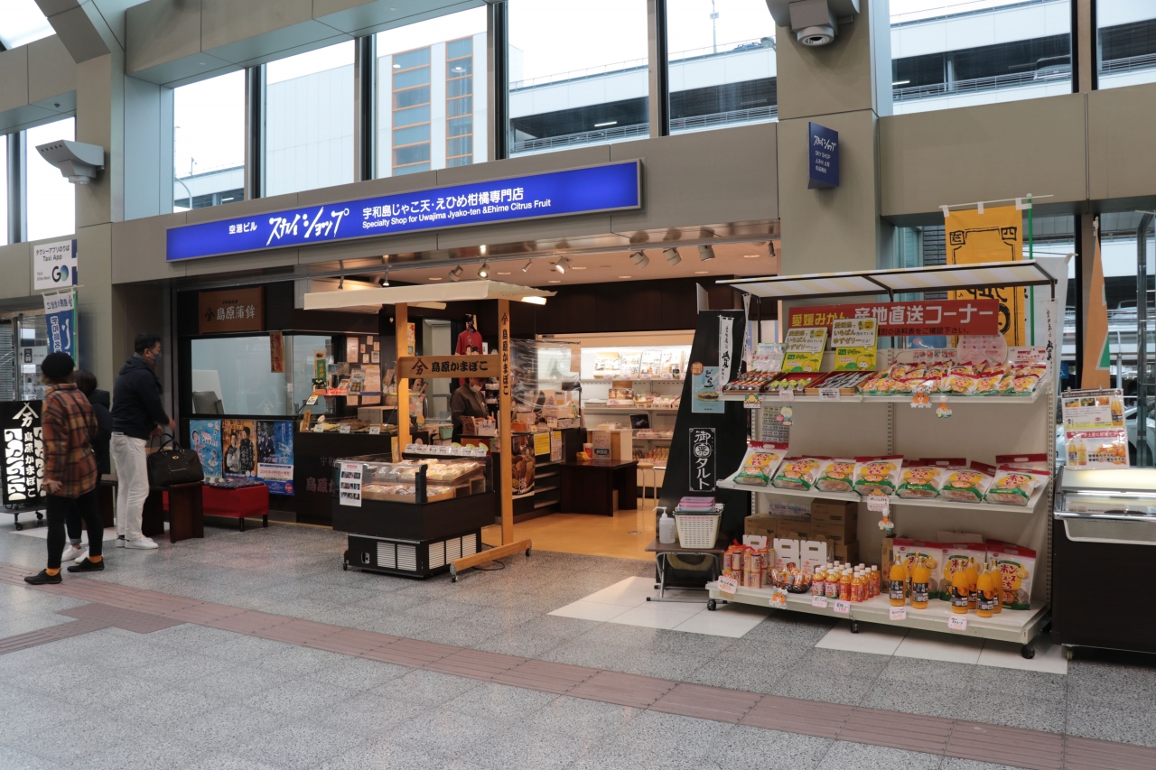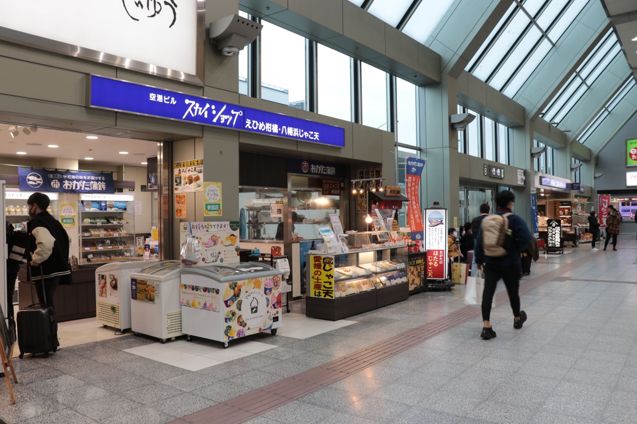 松山空港の1階、航空会社のカウンター向かいに細長い形態で営業しているお土産屋さん。じゃこ天など上げ蒲鉾やおつまみ品などのメジャーなものを取り扱っていますが、正直にいてしまうと品揃えは「地味」。好きな人にはもってこいかもしれませんが、訪問時はお客さんの姿はほとんどなく閑散としていました。スペースが狭く出入口を挟んで2か所に分かれているので、目的のものが見つからなかった場合はもう片方を探してみるというのも一つの手かもしれません。