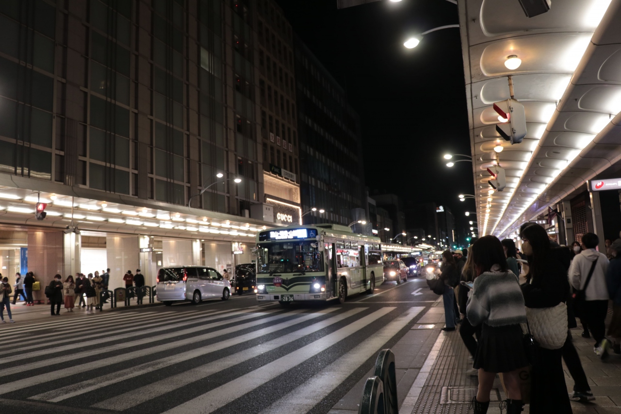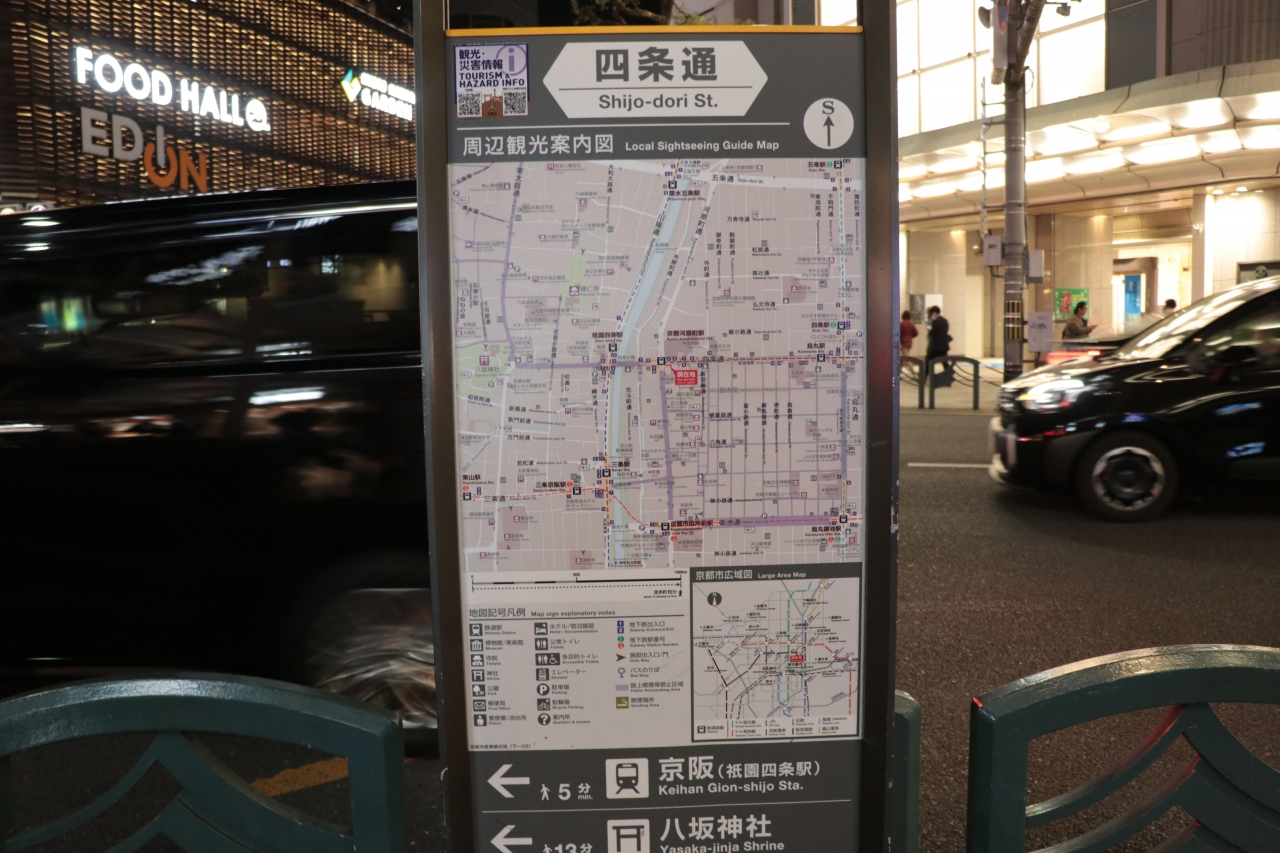 京都河原町駅から東側へ数十メートルの場所、四条通に位置しています。橋上に関しては片側2車線ですが、西側がすぐ交差点となっていることも関係しているのか車も人も通行量は多め。歩道部分はスペースがしっかり確保されているので人混みの中でも安心して歩けるのは良いところです。