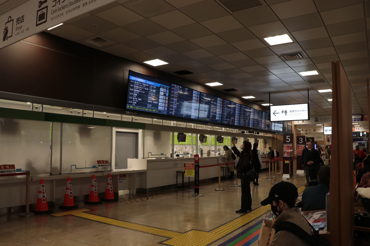 時間帯によって差はありますが、一部の便を除いたほぼ全ての高速バスがこちらを発着しており、窓口上の電光掲示板には様々な地域の名前がずらりと並んでいます。これまで何度も利用していますが、使うごとに毎回ワクワクしてしまうのは旅好きな人の宿命なのかな。。。
