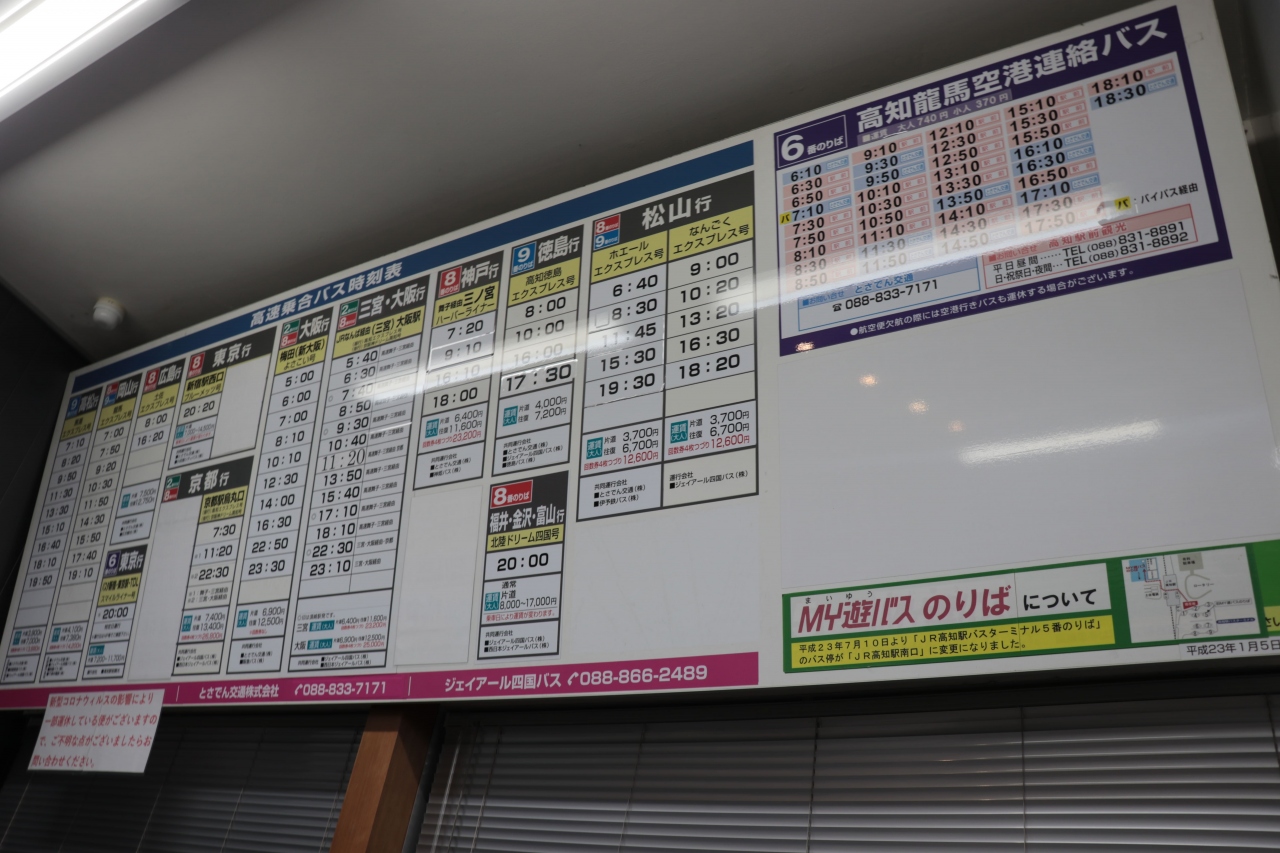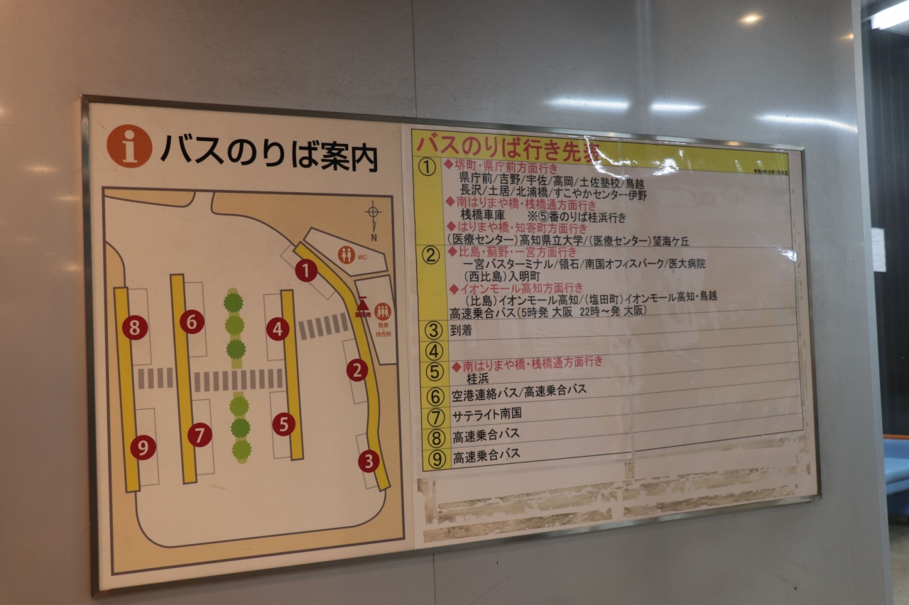 高知駅を発着するバスは全てこの北口側にあるターミナルから出発しており乗り場も9つと多く移動の拠点となっています。待合室内にはとさでん交通&JR四国バスの窓口も置かれておりそれぞれ乗車券の購入やフリー切符の販売などを行っているとのことでしたが、高知空港行のリムジンバスについては乗車券購入は券売機で現金のみの取り扱い、各種交通系ICカードは利用できずpaypayなどは車内で直接支払い・・・など一部制約があるので利用時は掲出してある説明をよく確認してからの利用がオススメです。