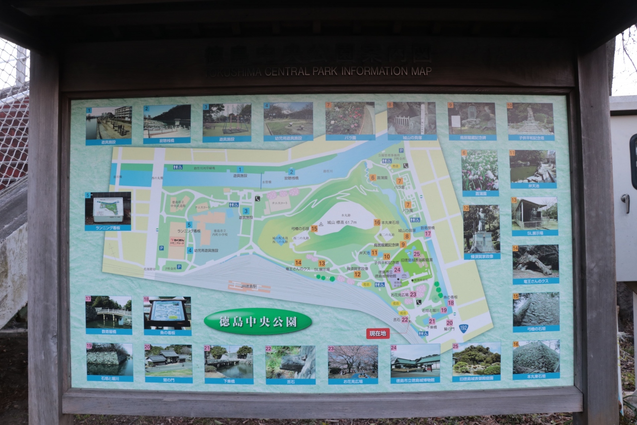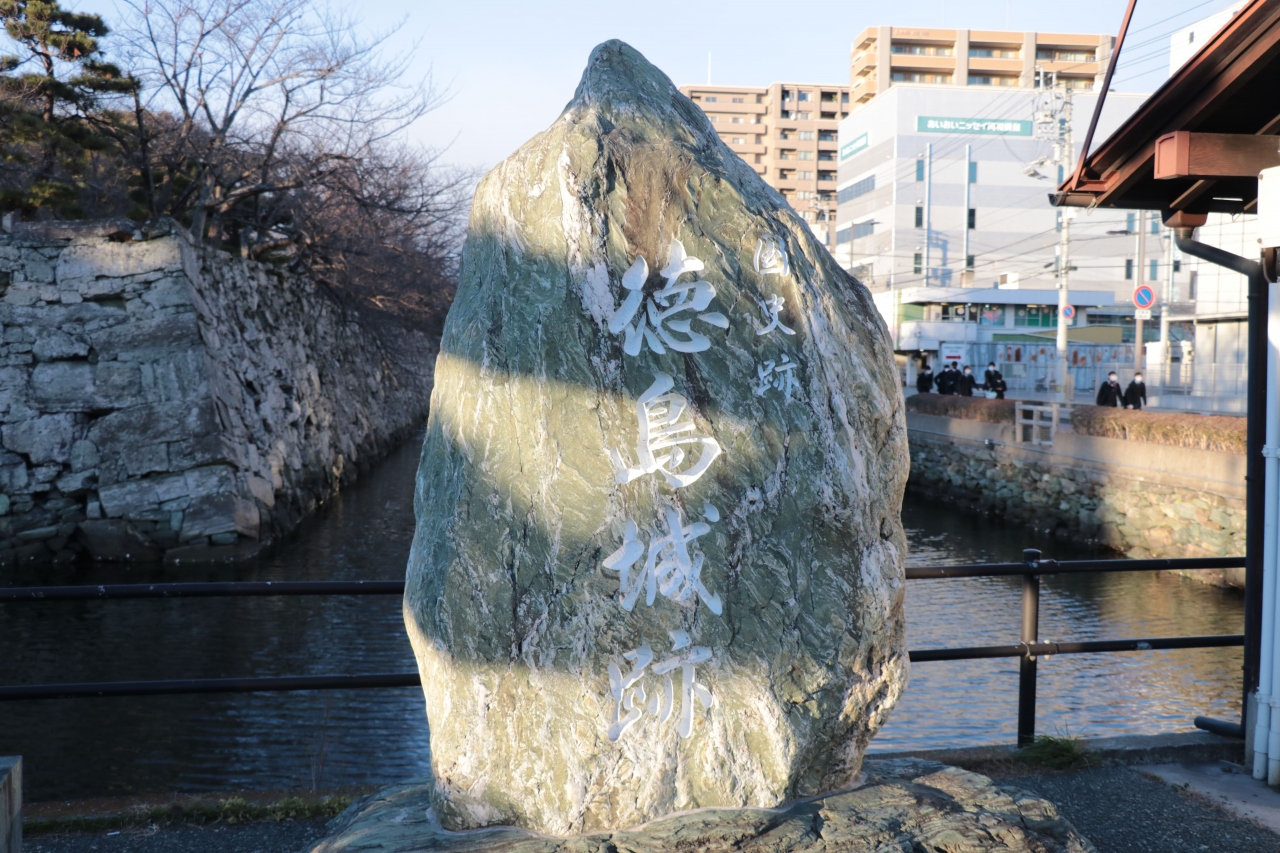 徳島駅から歩いて5分ちょっとの場所にある公園で、乗換時の時間つぶしも兼ねて歩いて訪問しました。徳島城の跡地をメインに博物館や庭園などが整備されています。平日だったせいか観光客の姿はほとんどなく、下校途中の学生さんや地域住民の散歩コースになっているようでした。