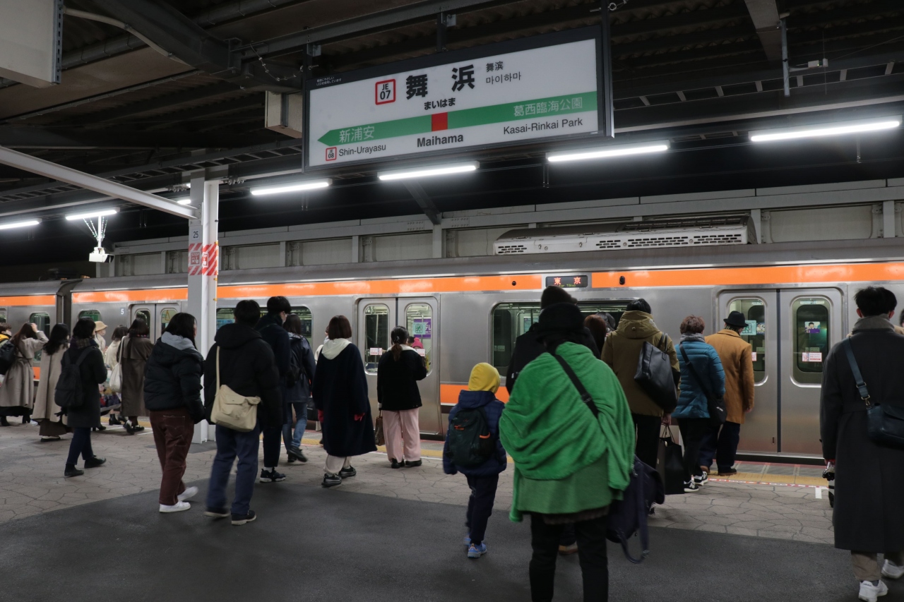 利用したのは週末夜の東京方面行の列車でした。テーマパークからの帰宅客で駅のホームは混雑していましたが、車内ではそうでもなかったようで苦労することなく席にありつくことができました。