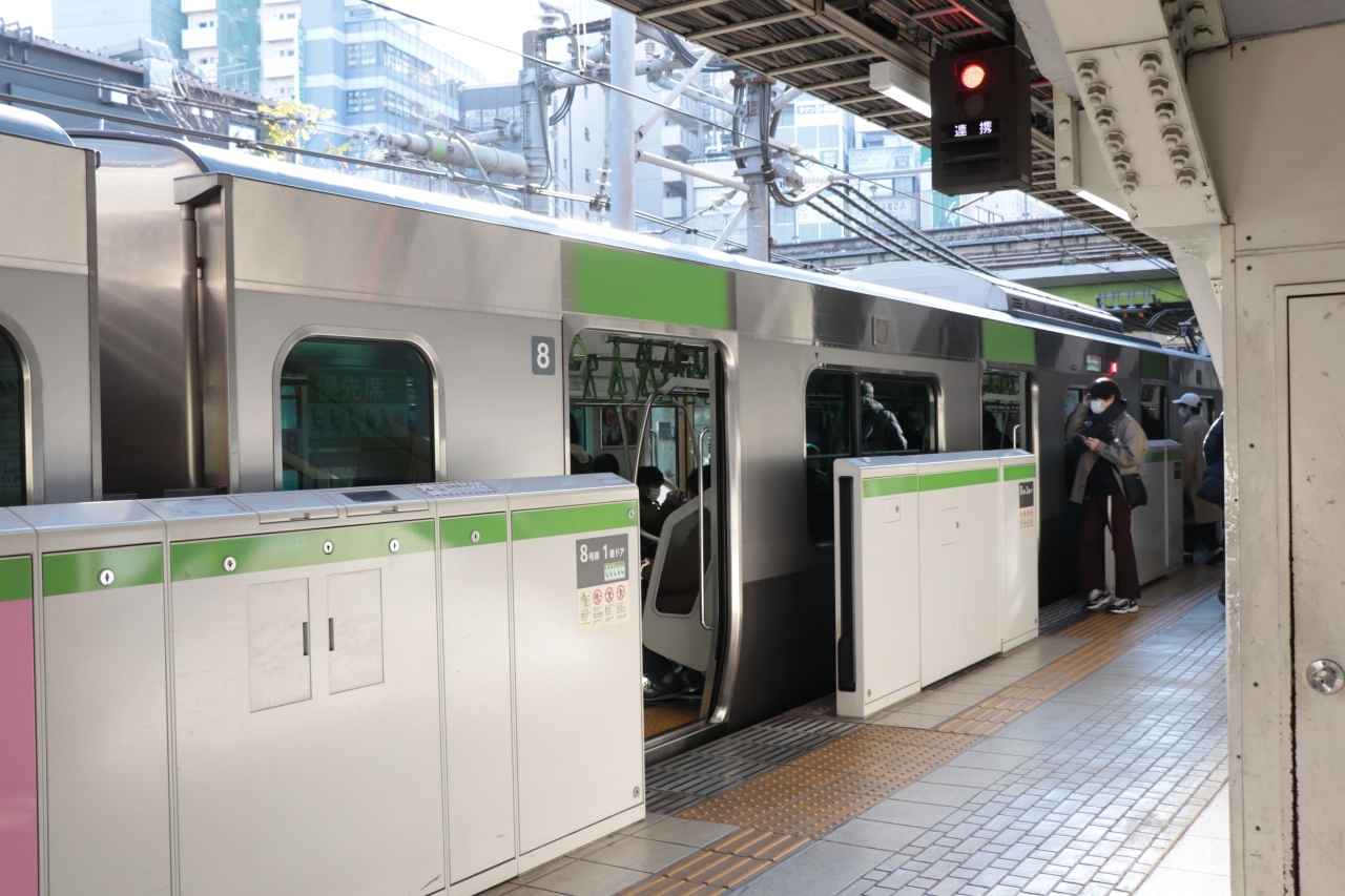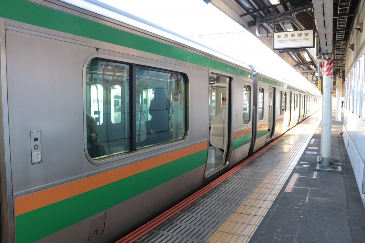 平日は通勤/通学ラッシュで非常に混み合う同路線ですが、利用した週末の朝方でも、階段などに近い編成中央付近に乗ってしまったせいか都心に近づくにつれてギュウギュウに近い乗車率となっていきました。駅によって多少の違いはありますが、グリーン車が連結されている真ん中付近に階段やエスカレーターが設置されている駅が多く、10,15両でも差があるものの混雑を避ける場合は端っこの方の号車が少しばかり空いているのかなといった感じでした。