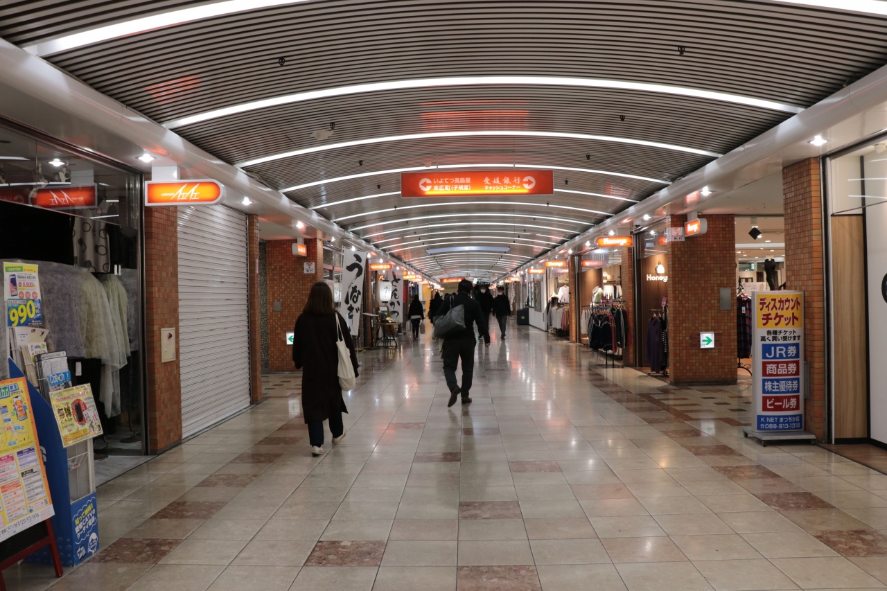 屋根の中央部分が盛り上がった構造となっており、左右の通路はそこまで広くないもののこうした場所にありがちな圧迫感や暗い感じはありませんでした。服飾・食料品などを中心にそこそこの数のショップが営業を行っており賑わいとまでは行きませんがシャッター通りとはなっておらず少し安心したところです。地下道を経由すれば伊予鉄道の松山市駅などから雨に濡れずに移動することも出いるので悪天候時でも安心。