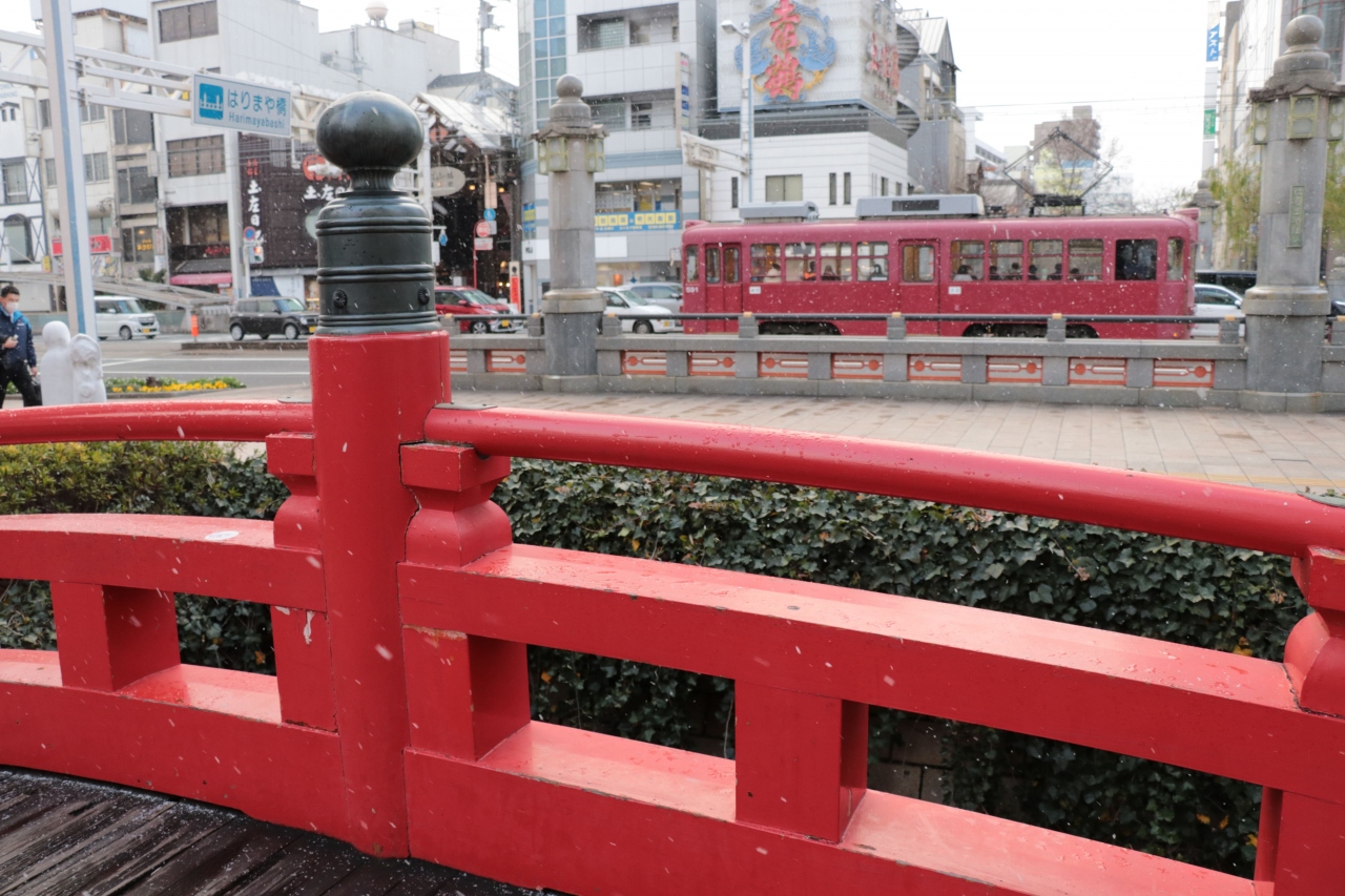 高知県と言えばここ!というレベルで有名な場所となっているはりまや橋。朱塗りの手すりとあっという間に終わってしまう橋の長さが目印になっています。訪問時は平日だったこともあり他に来訪者はいませんでしたが、別のタイミングで通りがかった際は観光客のs型も見られなんだかんだ言ってもみんな立ち寄る場所なんだなといった感じです。
