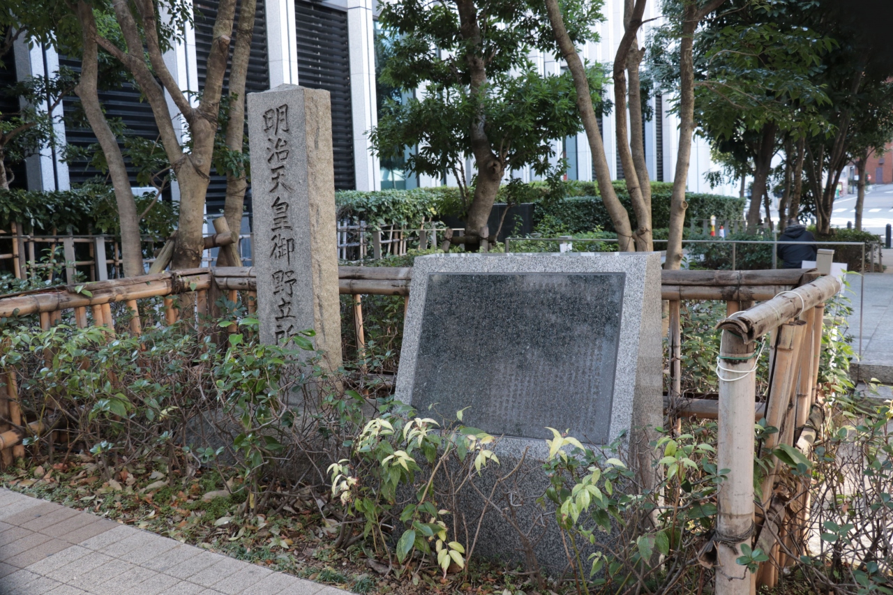 ビルが立ち並ぶ中でひっそりと建ててられている野立所跡。刻印されている文字は劣化のためか判読するのは難しそうですが、解説文はそこにしかないので目を凝らしてみるしかないのが現状といったところです。口コミの数からしても訪問者は限られており目的地になるような場所ではありませんが、緑に囲まれた広場の一角にあり都心部の中でもゆったりとした気分になれる場所と言えそうです。見学スペースなどはないので、歩道から見る際は通行者の妨げにならないように注意が必要です。