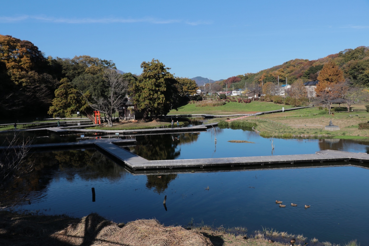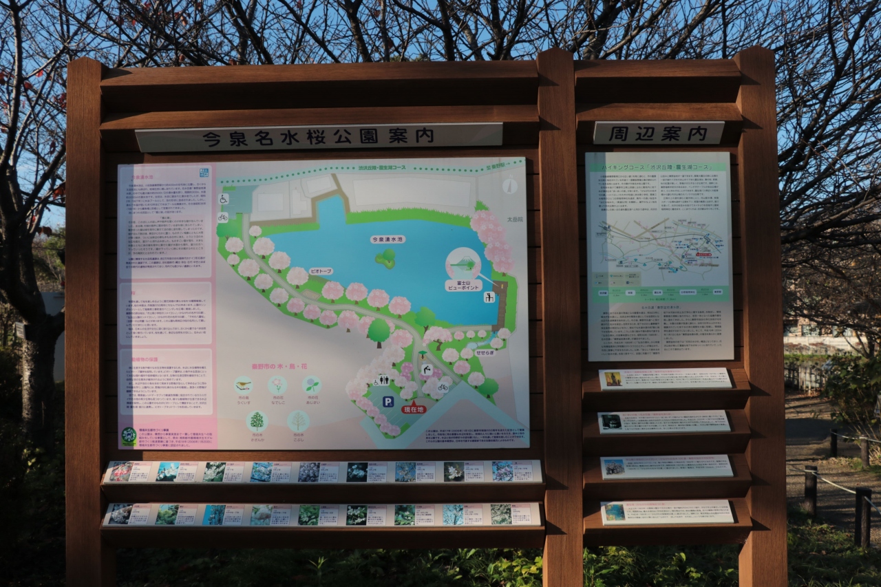 ちょっとした池と周囲を散策できる小道が整備されている公園となっています。駐車場は非常に狭く5-6台分ほど(公園の反対側にもありますがこちらは身障者のみ利用可)となっており、出入り口の道幅も広くないので不慣れな人は徒歩などでのアクセスが良いかもしれません。桜が綺麗に咲くスポットとして知られている他、ウッドデッキの先からは冬場の晴天時に富士山の姿を望むことができる日も。また、屋根付きのテーブルと椅子もあるので先着1組だけではありますが飲食物をもってこればゆっくりと過ごすことができるようになっています。
