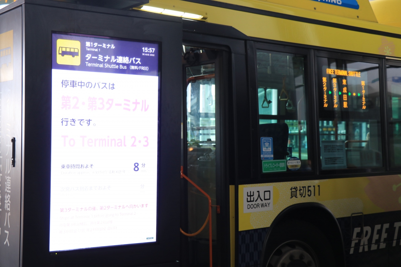 各ターミナルを結ぶ無料のシャトルバス。第2-第3ターミナル間は歩いて行き来できますが、第1ターミナルが絡んでくるとバス利用が必須となります。旅客数は全盛期まで戻ってはいませんが、5分毎の運行となっており本数は多め。車内は空港関係者らしき人の姿が目立っていました。専用塗装車が使われていますが通常の路線バスと同じもののため、車内には段差がある部分も。スーツケースなどの大きな荷物がある時や乗降時の足元には十分注意が必要です。