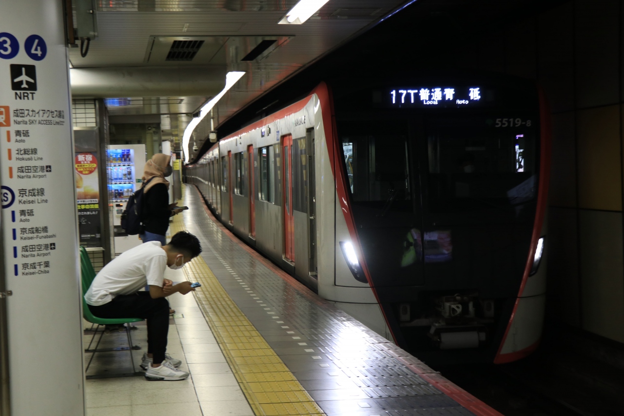 上野・日暮里から船橋や津田沼を経由して成田空港まで結ぶ重要な路線。途中まではJRと近い位置を走っておりお互いの車両がじかに見えることもあるほど。近い分、どちらかが止まった際には振り替え輸送がしやすいほどの利便性もありそうですが、経営的な面を心配してしまうところでもあります。ただ、末端区間に近くなると空港があるせいか関係者らしき人がそこそこ乗っている姿を目にしてちょっと安心した一面も。