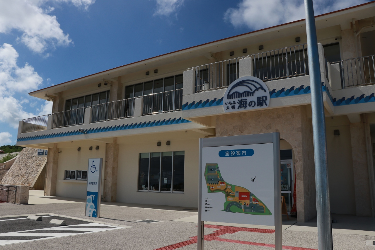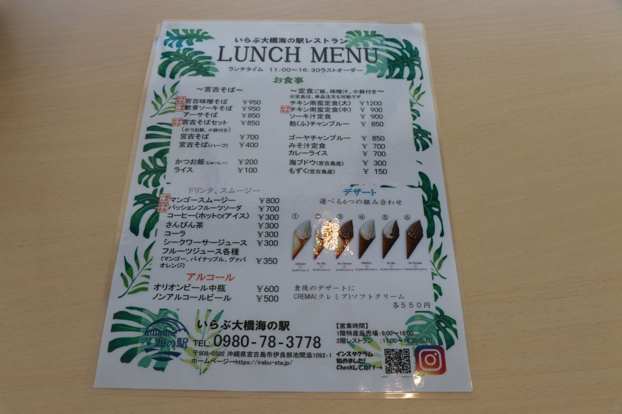 伊良部大橋を一望する高台にあり、2階のレストランでは宮古そばや定食などを頂くことができます。メニュー数はそこそこあり値段もお手頃。14時過ぎの訪問でしたが他にもお客さんはいたものの多くなく、窓の外に映る綺麗な景色をゆったりと眺めることができました。