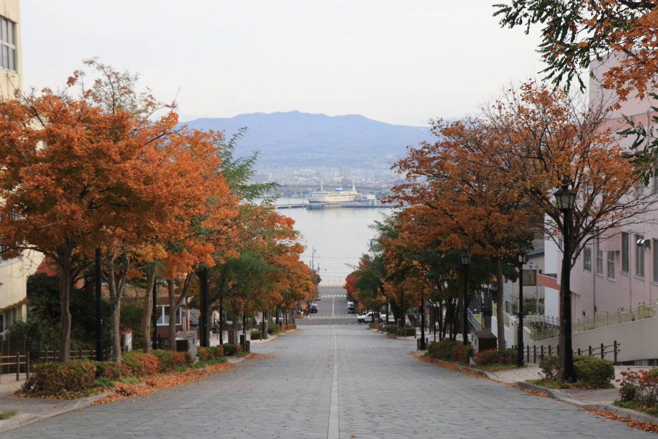 ホテルから紅葉が綺麗そうなのが見えたので朝の人が少ないであろう時間帯に訪問。道路上に車がいるのが気にくわない方や海までストレートに見渡せる景色を撮りたい方にはこの時間帯がオススメです。