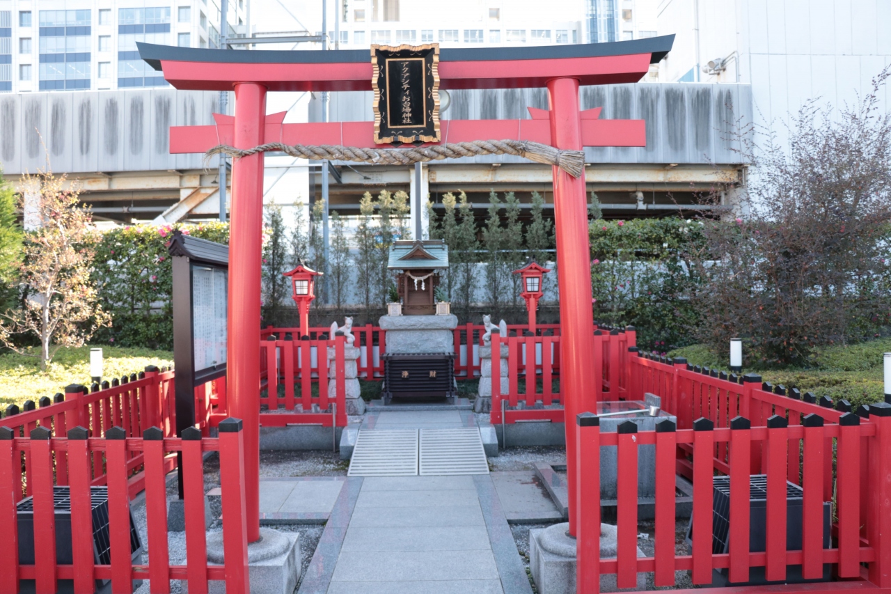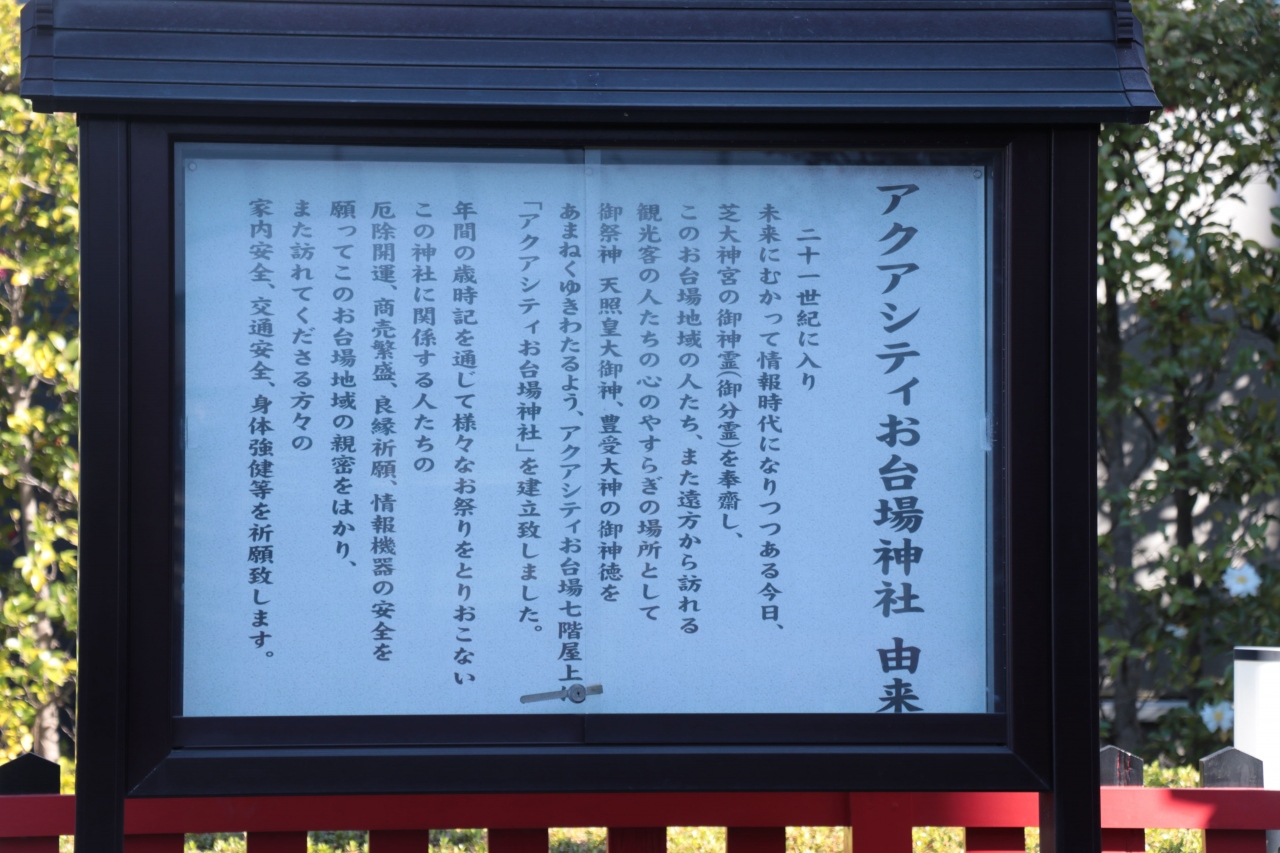 アクアシティの屋上にありますが、エスカレーターで登っていくとなぜか6階のあたりから現れる鳥居という点では存在感のある場所かなという印象を受けます。神社も含めてサイズは大きくないもののしっかりとした本殿となっており、お賽銭箱も設置してありました。後ろにはフジテレビの本社ビルや球体展望室をはじめ、反対側にはレインボーブリッジの姿も見られる場所となっておりデートスポットにも使えそう。