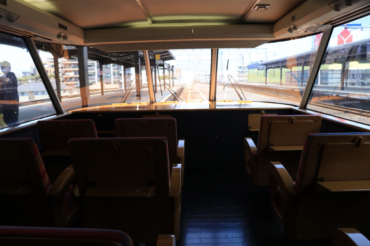 週末のみの運行ということもあり展望席の1番前は1か月前の発売と同時にすぐ埋まったようでした。3-4列ほどありますが、やはり乗るなら他の人に邪魔をされない最前列に乗りたいところです。二人掛けと一人掛けという配置になっていますが、個人的には一人掛けの方が立野や阿蘇などの景色を堪能できるのかなと感じたので参考にしていただければ幸いです。ちなみに、展望席はチケットがないと立ち入ることもできないとのこと。追加料金を払っていることもありそうした配慮がなされているのかもしれません。