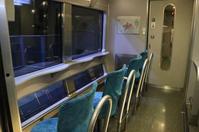 複数種類の車両が充当されていることから一部列車のみの設置となっていますが、編成中ほどに海を向いて利用できるサロンのようなスペースが設置されているところがありました。こちらは自由席で空いている限り誰でも気軽に利用することができます。丸椅子にテーブル、山側はソファとなっており時間を忘れてくつろぐことができますが、混雑時は譲り合って利用したいところです。