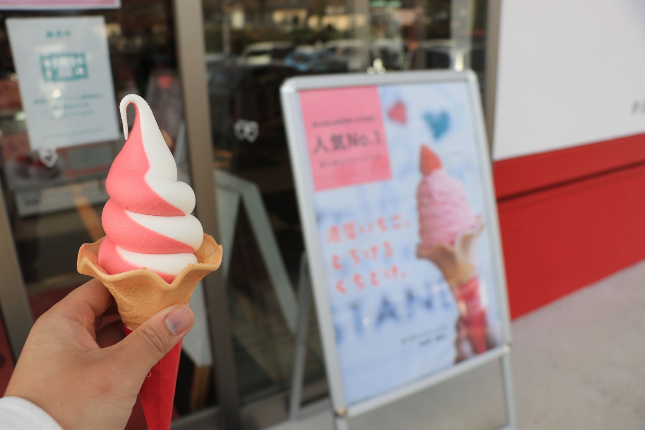 カフェと売店と分かれておりこちらはカウンター式で販売している店舗となります。(cafeでは座ってゆっくり頂けるようです) バニラとストロベリーが半分ずつ入ったソフトを注文しましたが、ストロベリーは香りも良くバニラとの相性も非常にマッチしていて美味しくいただくことができました。